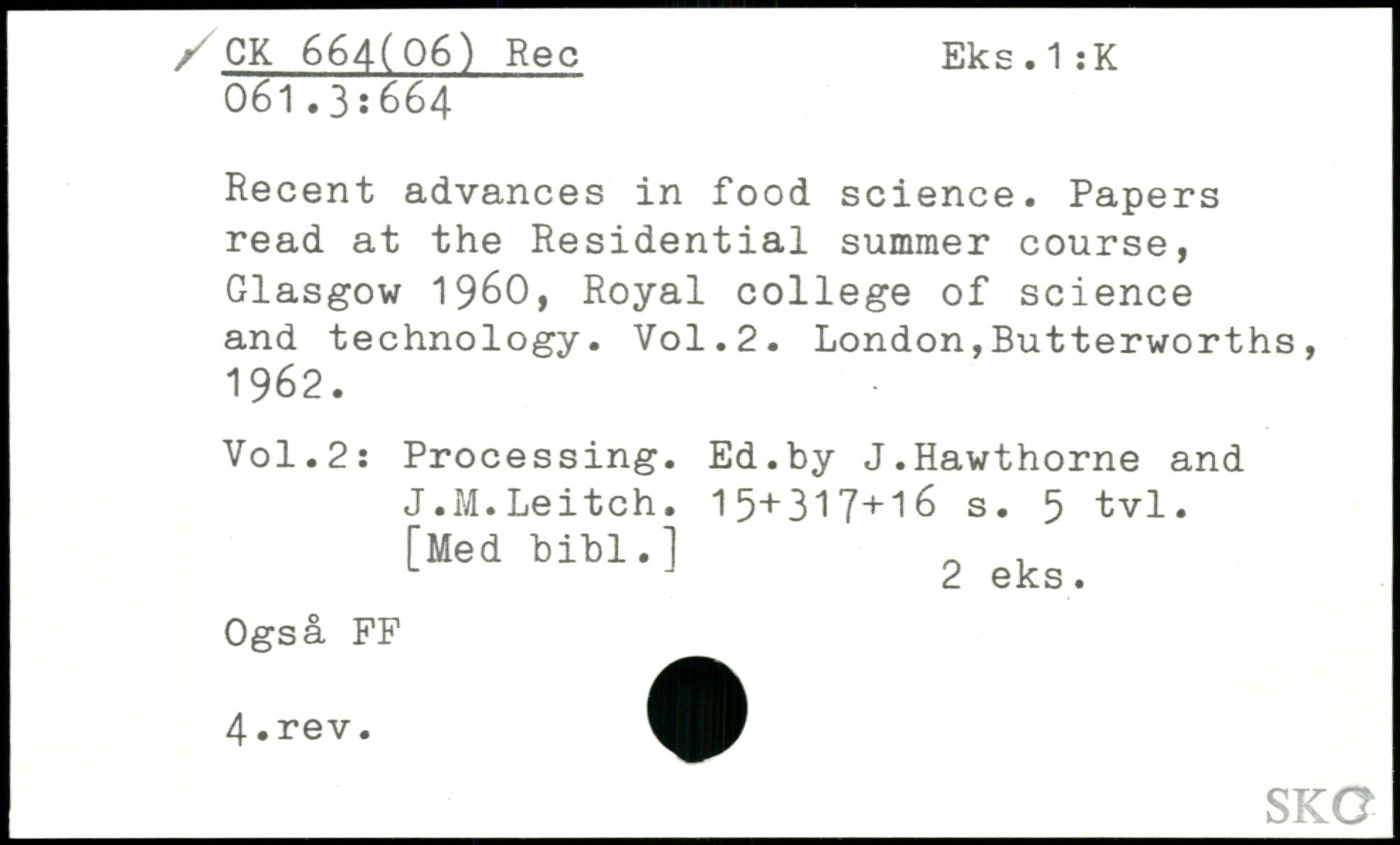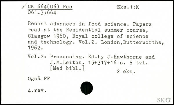 Recent advances in food science. Papers read at the Residential summer course, Glasgow 1960, Royal college of science and technology.