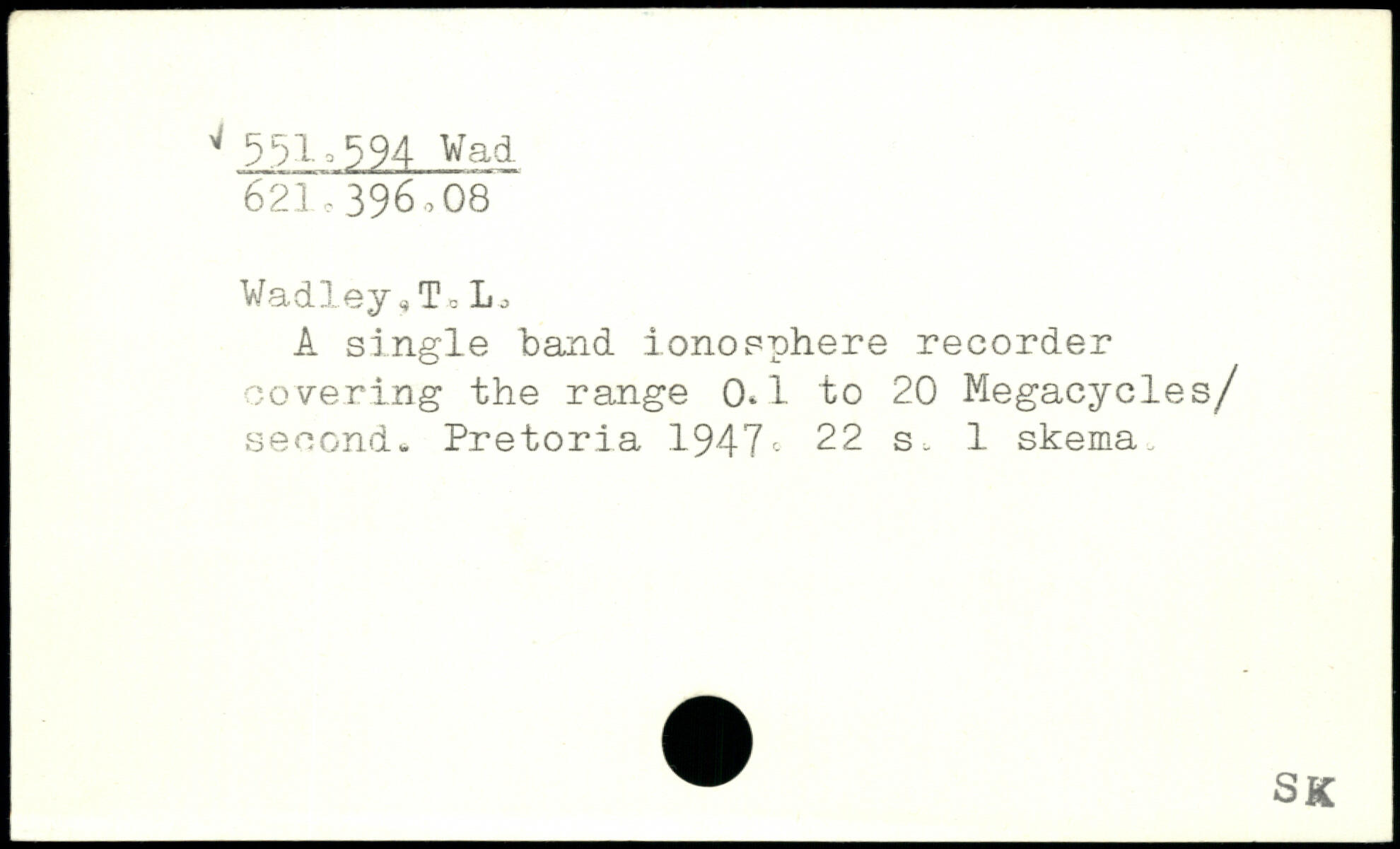 A single band ionosphere recorder covering the range 0.1 to 20 Megacycles/ second,, Pretoria 1947c
