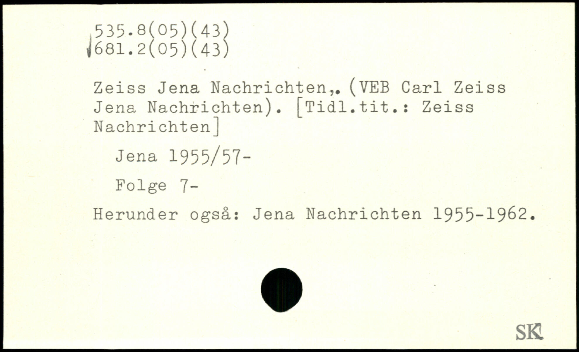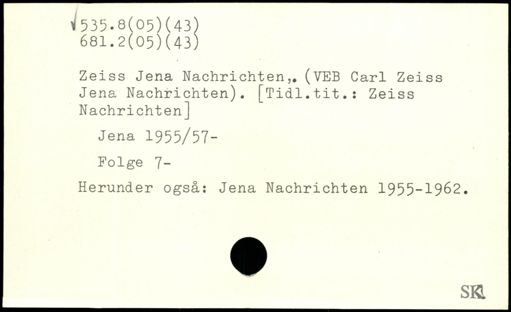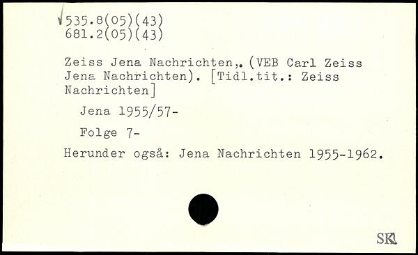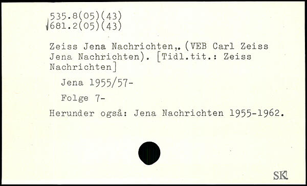 Zeiss Jena Nachrichten,. (VEB Carl Zeiss Jena Nachrichten). [Tidl.tit.: Zeiss Nachrichten] Jena 1 955/57- Folge 7- Herunder også: Jena Nachrichten 1955-1962.