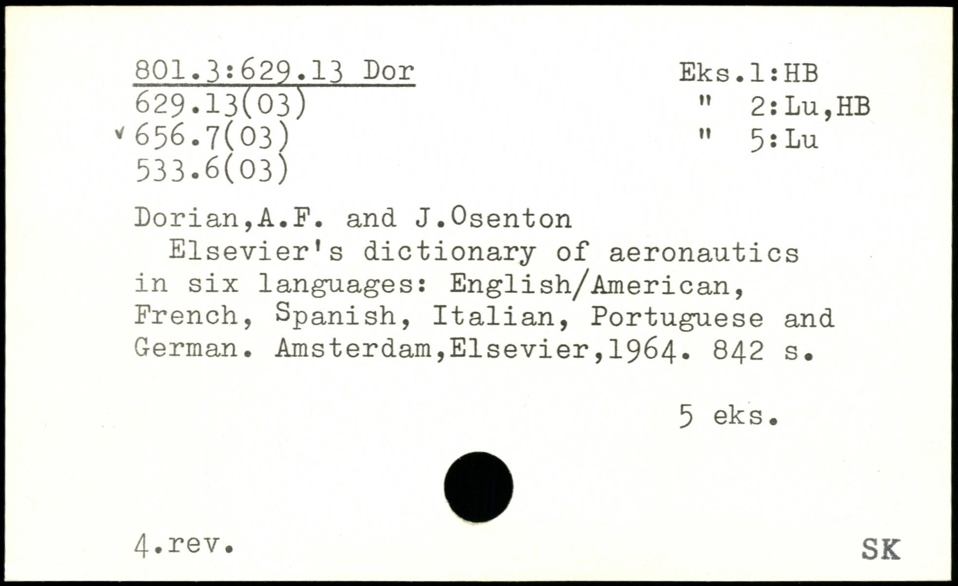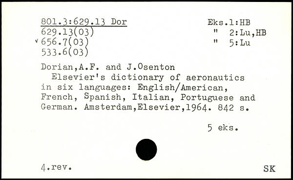 Elsevier's dictionary of aeronautics in six languages: English/American, French, Spanish, Italian, Portuguese and German.