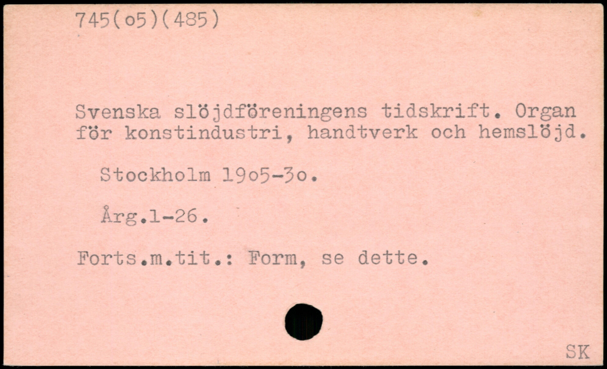Svenska slöjdföreningens tidskrift. Organ för konstindustri, handtverk och hemslöjd. Stockholm 19o5~3o. Årg.1-26. Ports.m.tit.: Porm, se dette.