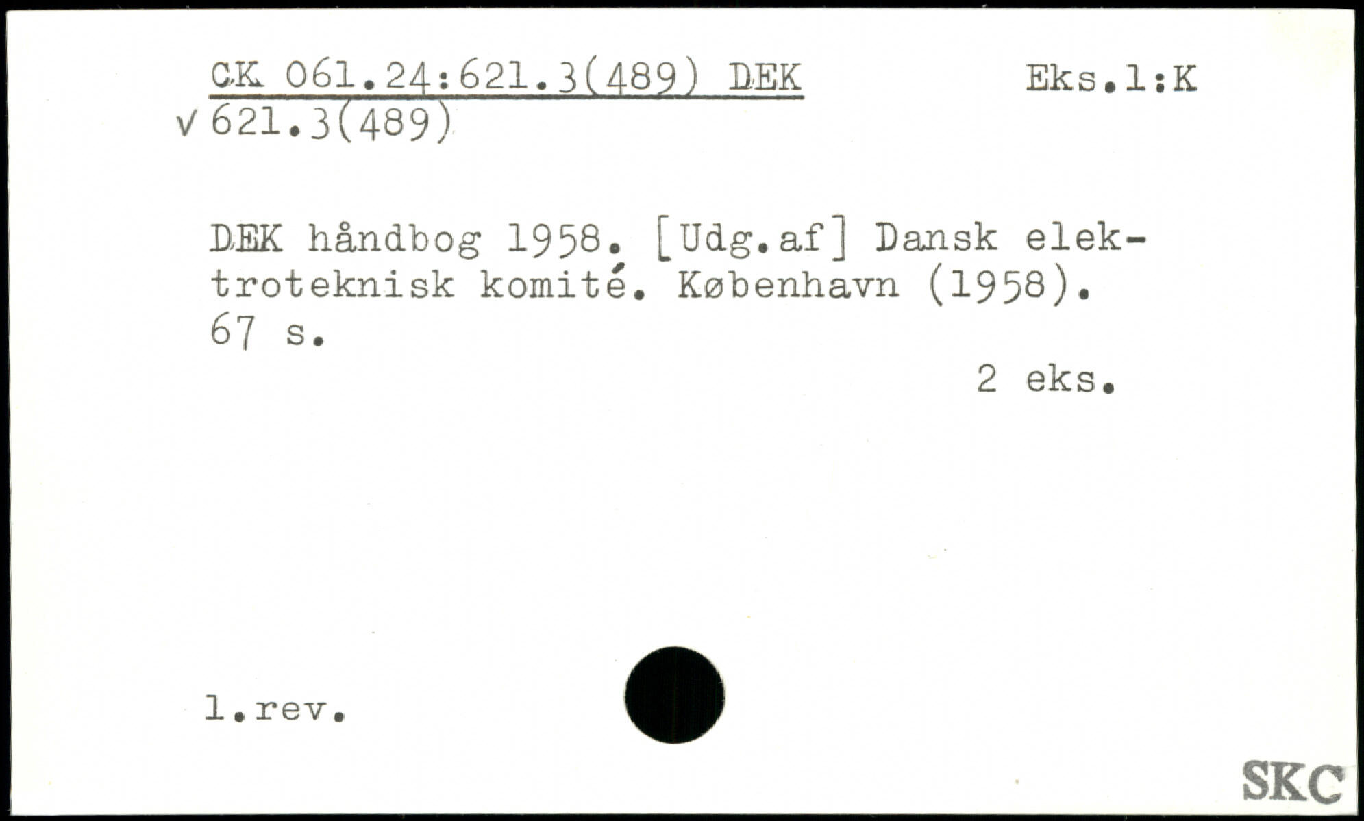 BEK håndbog 1958, [Udg.af] Dansk elektroteknisk komité. København (1958)