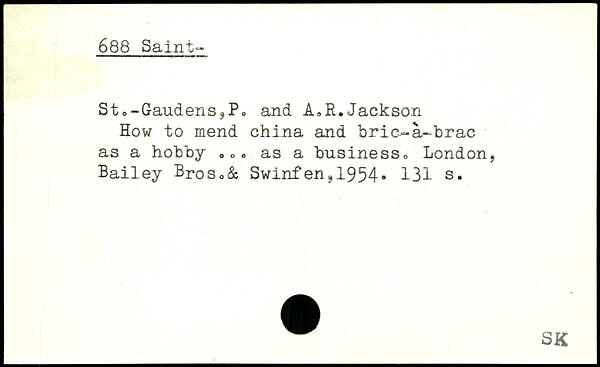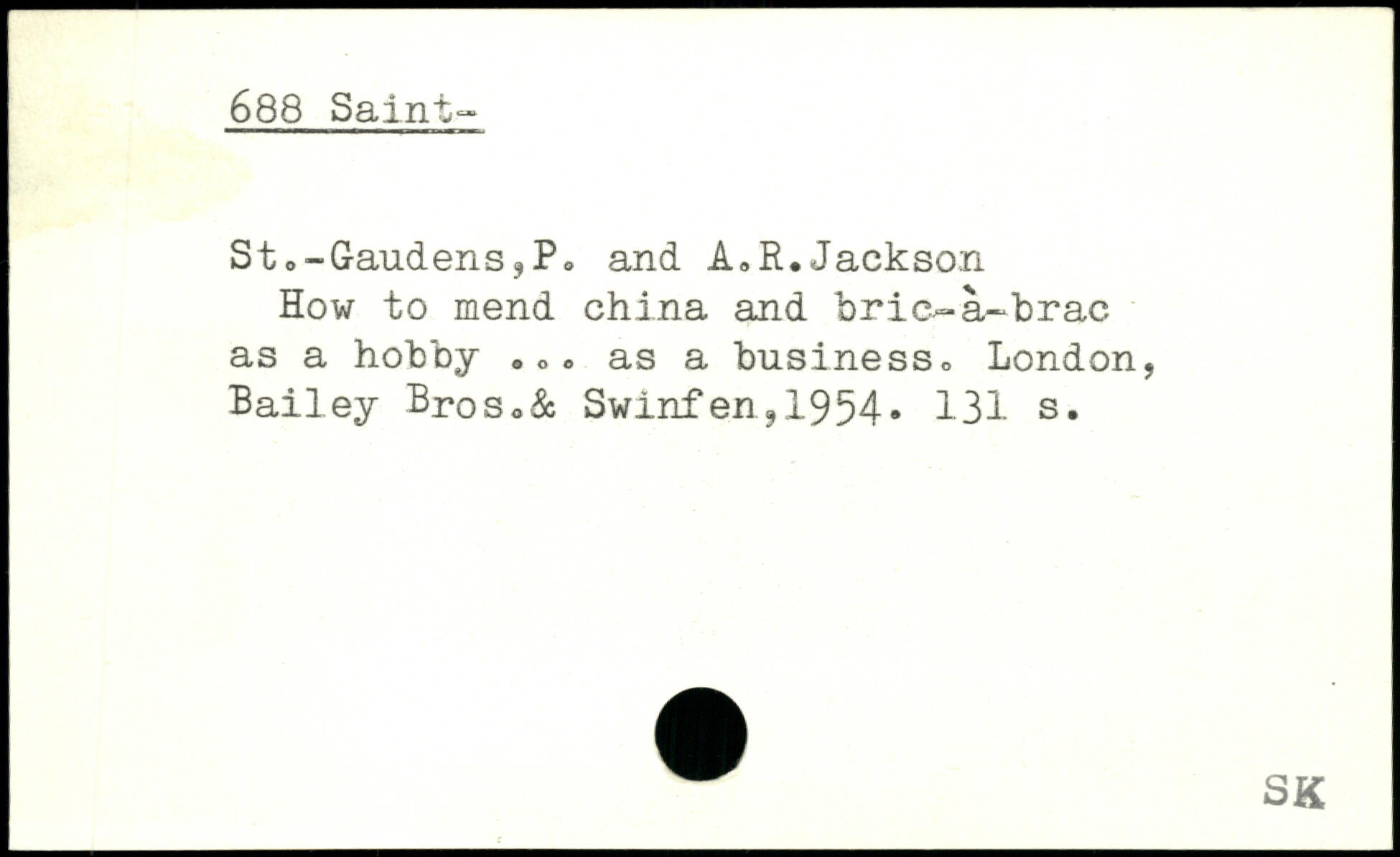 St,-Gaudens,Po and A.R.Jackson How to mend china and brio-a-brac as a hobby. - - as a business- London, Bailey Bros.& Swinfen,1954.