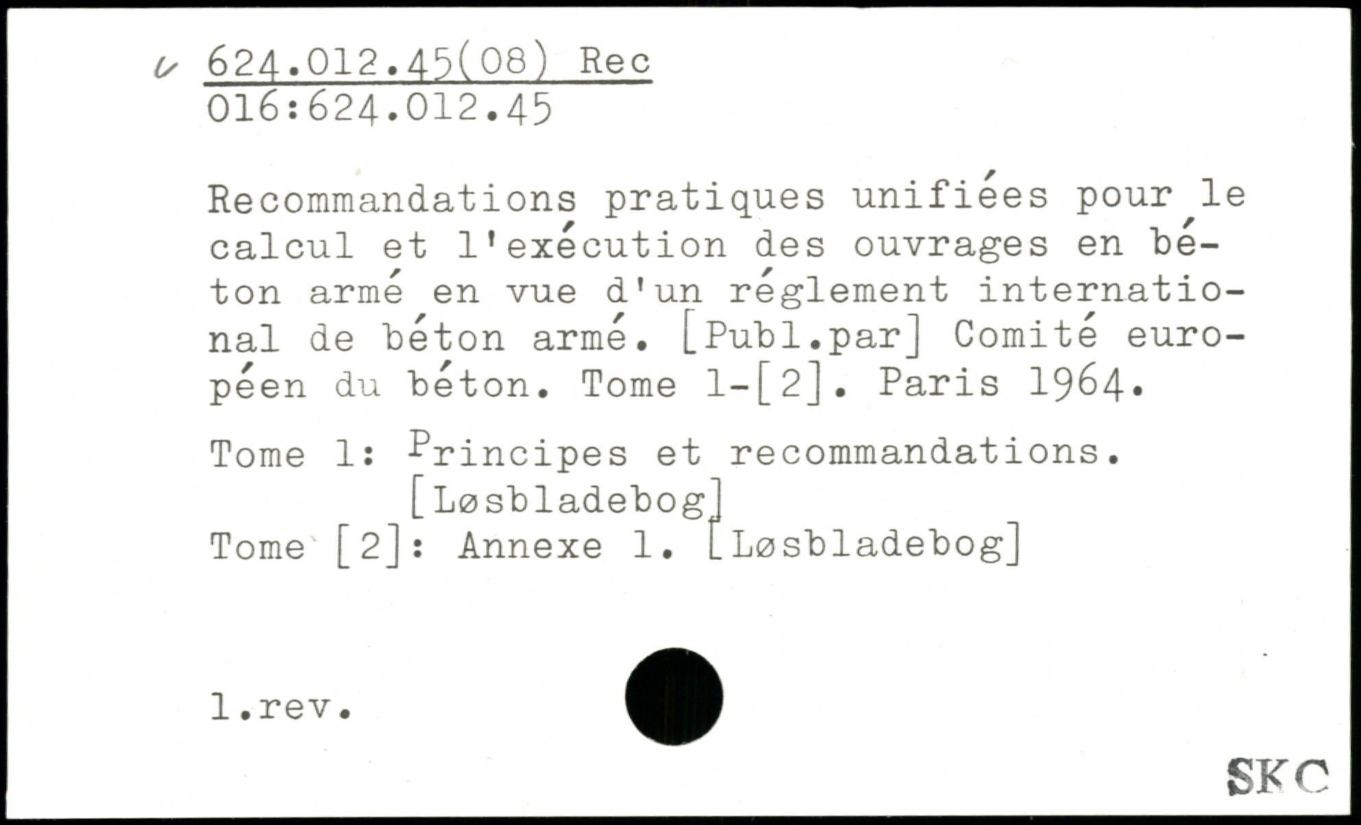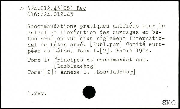 Recommandations pratiques unifiées pour le calcul et l’exécution des ouvrages en béton arme en vue d'un reglement international de béton armé. [Publ.par] Comité européen du béton. Tome 1—[2J.