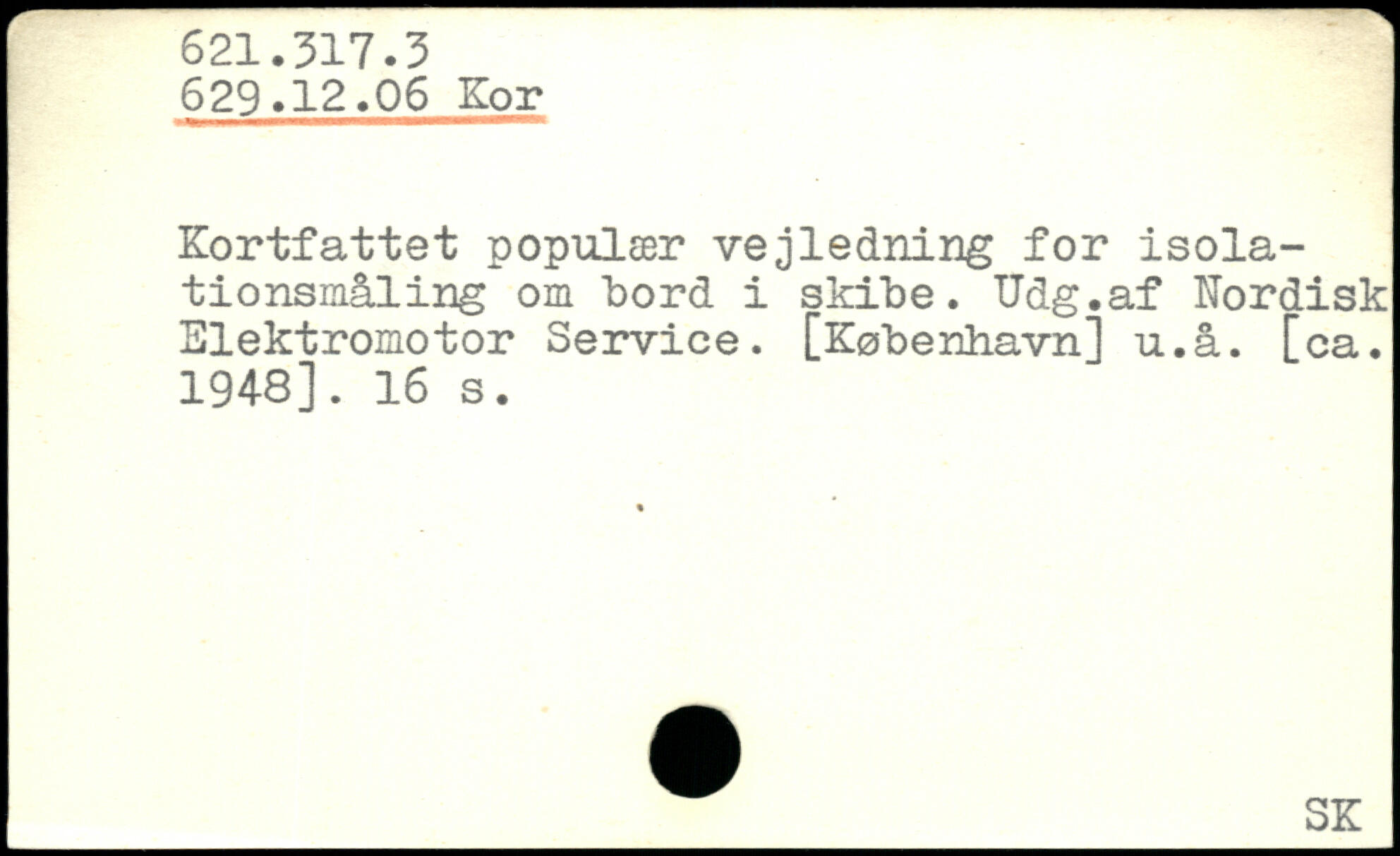 Kortfattet populær vejledning for isolationsmåling om bord i skibe. Udg.af Kordisk Elektromotor Service. [København] u.å. [ca. 1948].