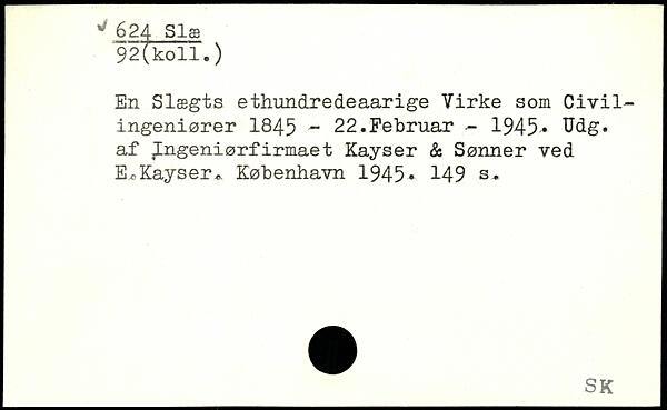 92(koli.) En Slægts ethundredeaarige Virke som Civilingeniører 1845 - 22.Februar - 1945. Udg. af ^Ingeniørfirmaet Kayser & Sønner ved E. Kayser..