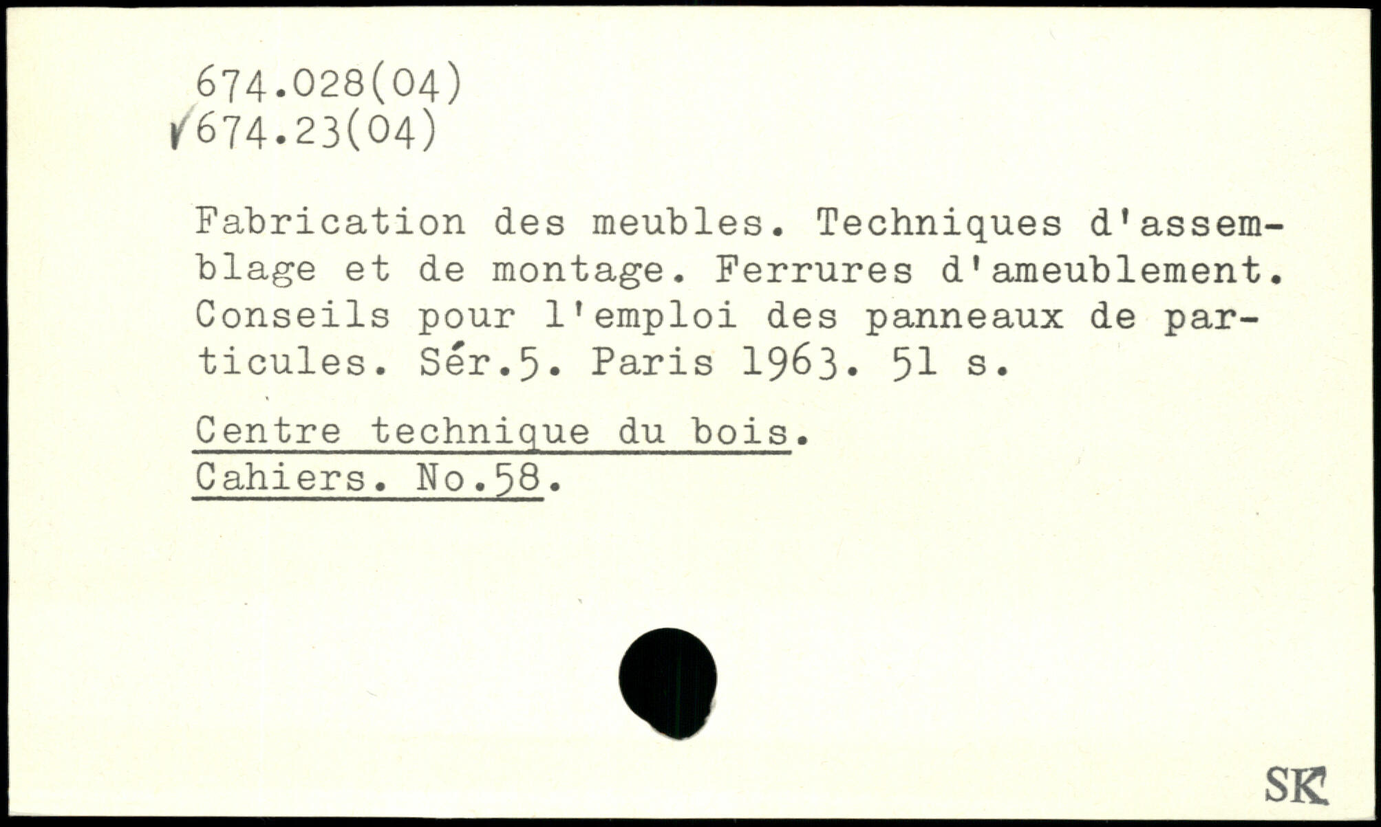 Fabrication des meubles. Techniques d'assemblage et de montage. Ferrures d'ameublement. Conseils pour l'emploi des panneaux de particules. Sir.5.