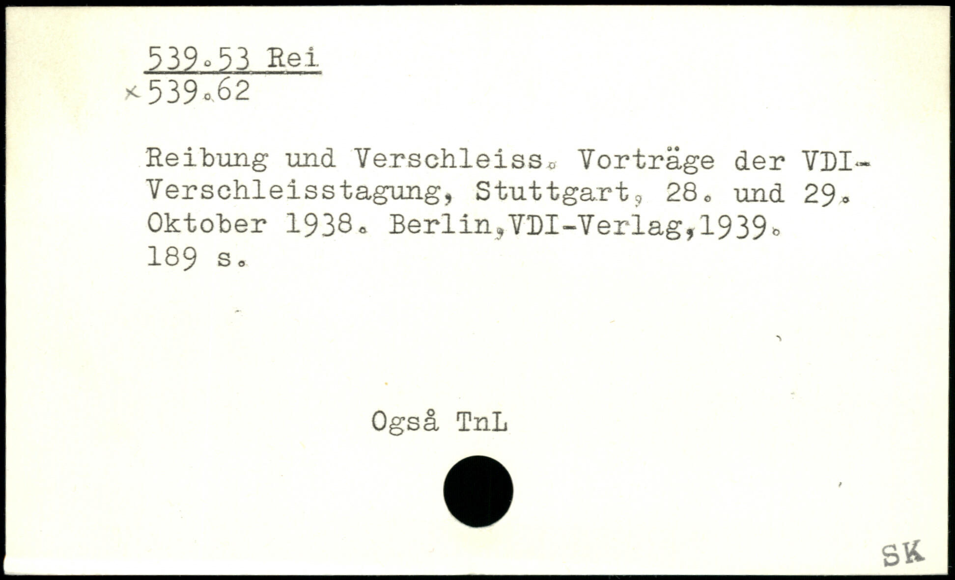 Reibung und Verschleiss. Vorträge der VDI-Verschleisstagung, Stuttgart, 28, und 29, Oktober 1938, Berlin^VDI-Verlag,1939.