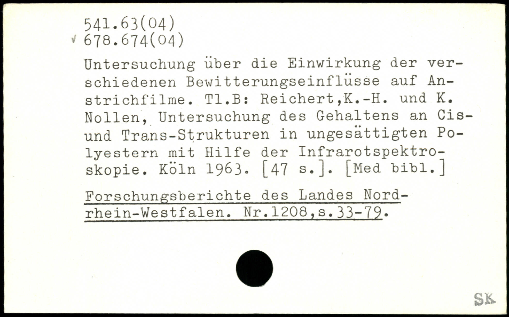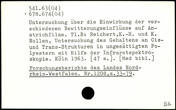Untersuchung über die Einwirkung der verschiedenen Bewitterungseinflüsse auf Anstrichfilme. Tl.B: Reichert,K.-H. und K. Nöllen, Untersuchung des Gehaltens an Cis-und Trans-Strukturen in ungesättigten Polyestern mit Hilfe der InfrarotSpektroskopie.