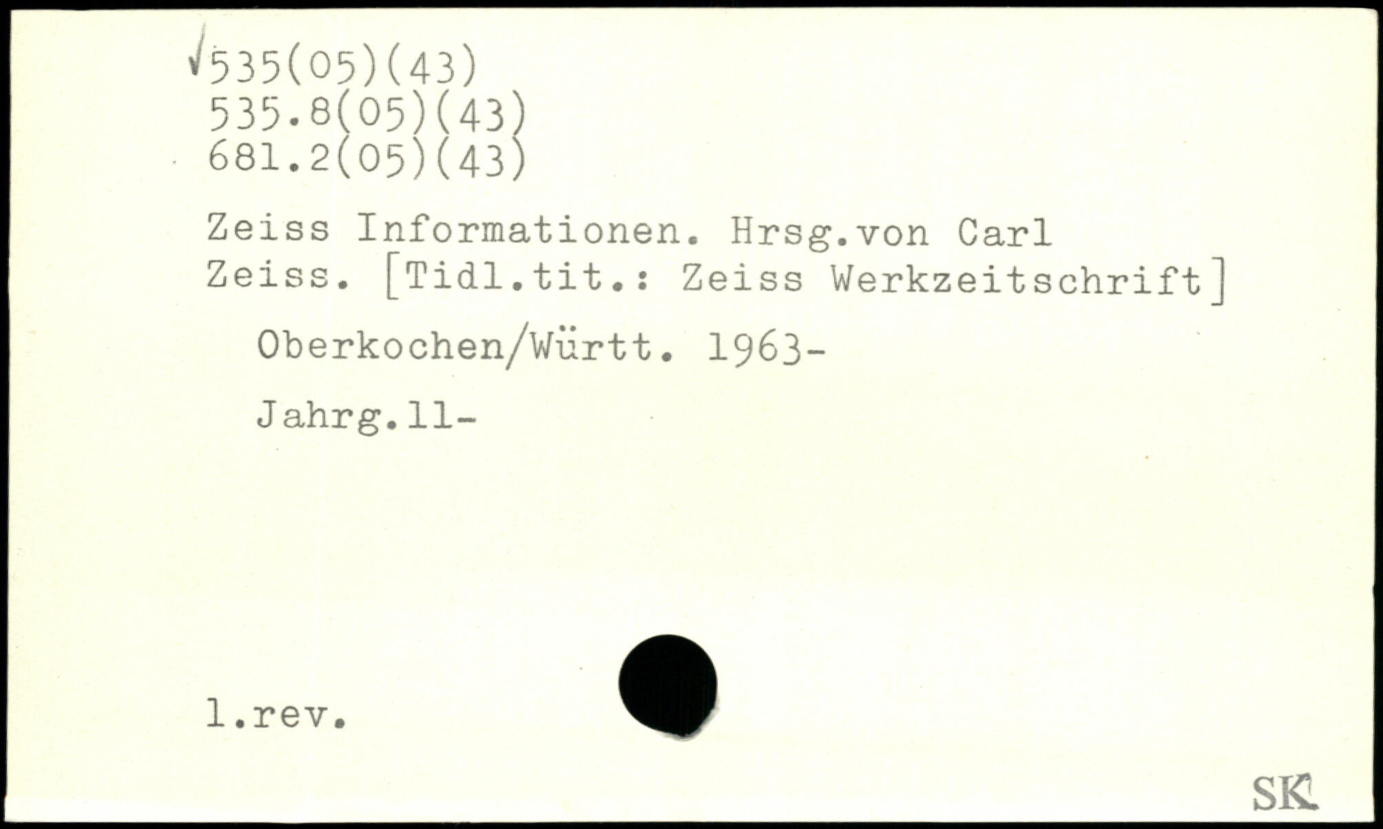 Zeiss Informationen. Hrsg.von Carl Zeiss. [Tidl.tit.: Zeiss Werkzeitschrift] Oberkochen/württ. 1963- Jahrg.11-