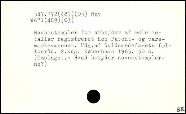 Navnestempler for arbejder af ædle metaller registreret hos Patent- og varemærkevæsenet. Udg.af Guldsmedefagets fællesråd.