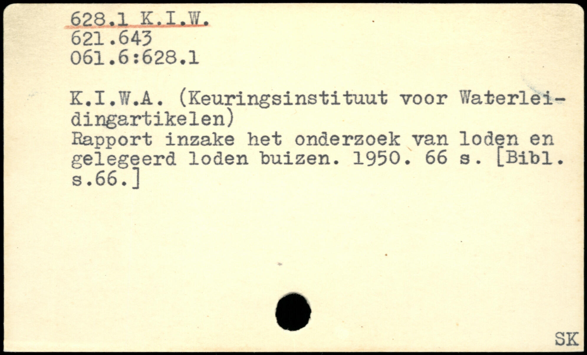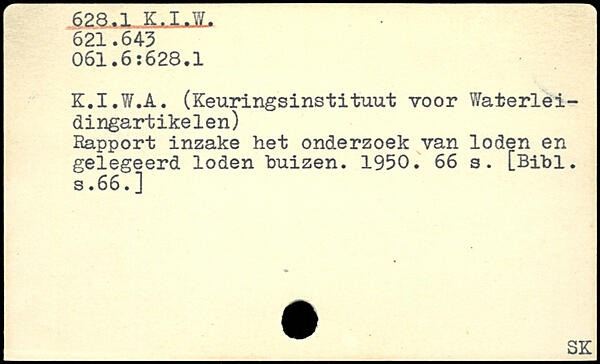 K.I.W.A. (Keurlngsinstituut voor Waterlei-dingartikelen) Rapport inzake het onderzoek van loden en gelegeerd loden buizen. 1950.
