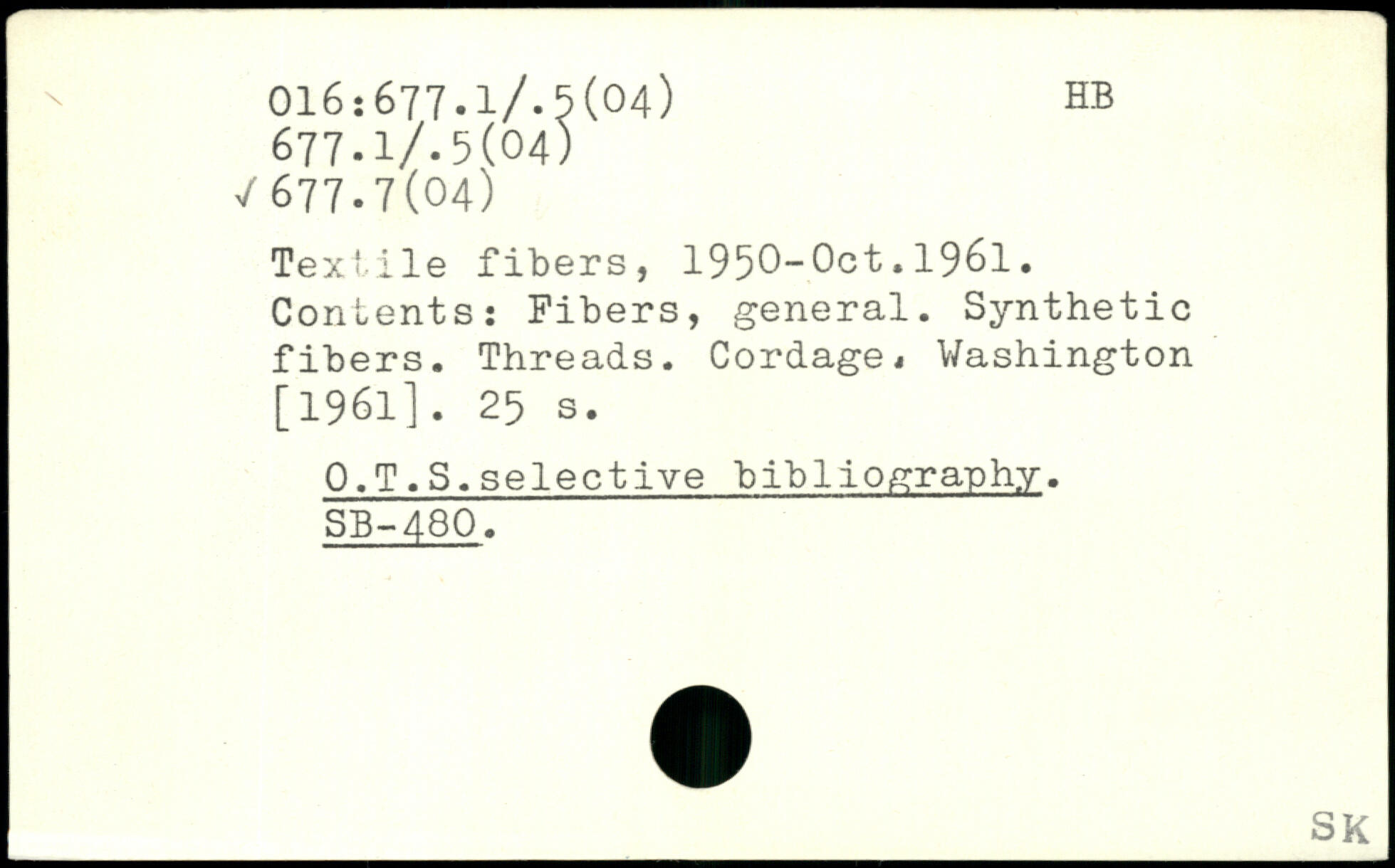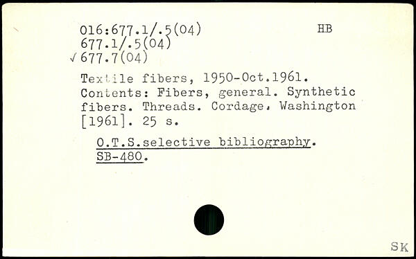 Textile fibers, 1950-Oct,1961. Contents: Fibers, general. Synthetic fibers. Threads. Cordages Washington