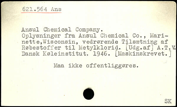 Ansul Chemical Company. Oplysninger fra Ansul Chemical Co., Marinett e,Wisconsin, vedrørende Tilsætning af Røbestoffer til Metylklorid. [Udg.af] A.T.V. Ransk Køleinstitut. 1946. [Maskinskrevet.] Maa ikke offentliggøres.
