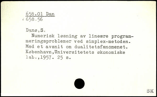 Numerisk løsning av lineære programmeringsproblemer ved simplex-metoden. Med et avsnit om duaiitetsfænomenet. København,Universitetets økonomiske lab >,1957.