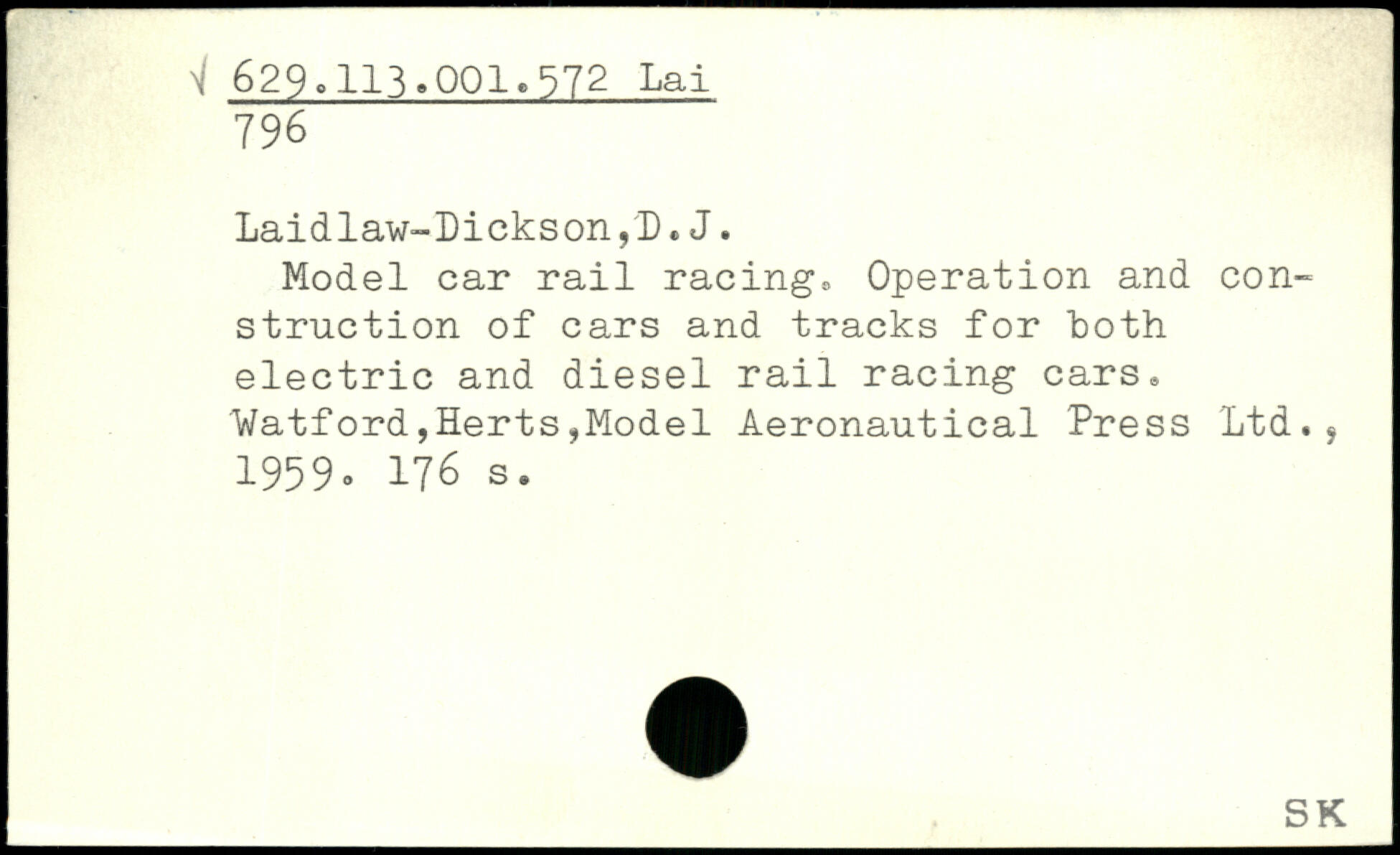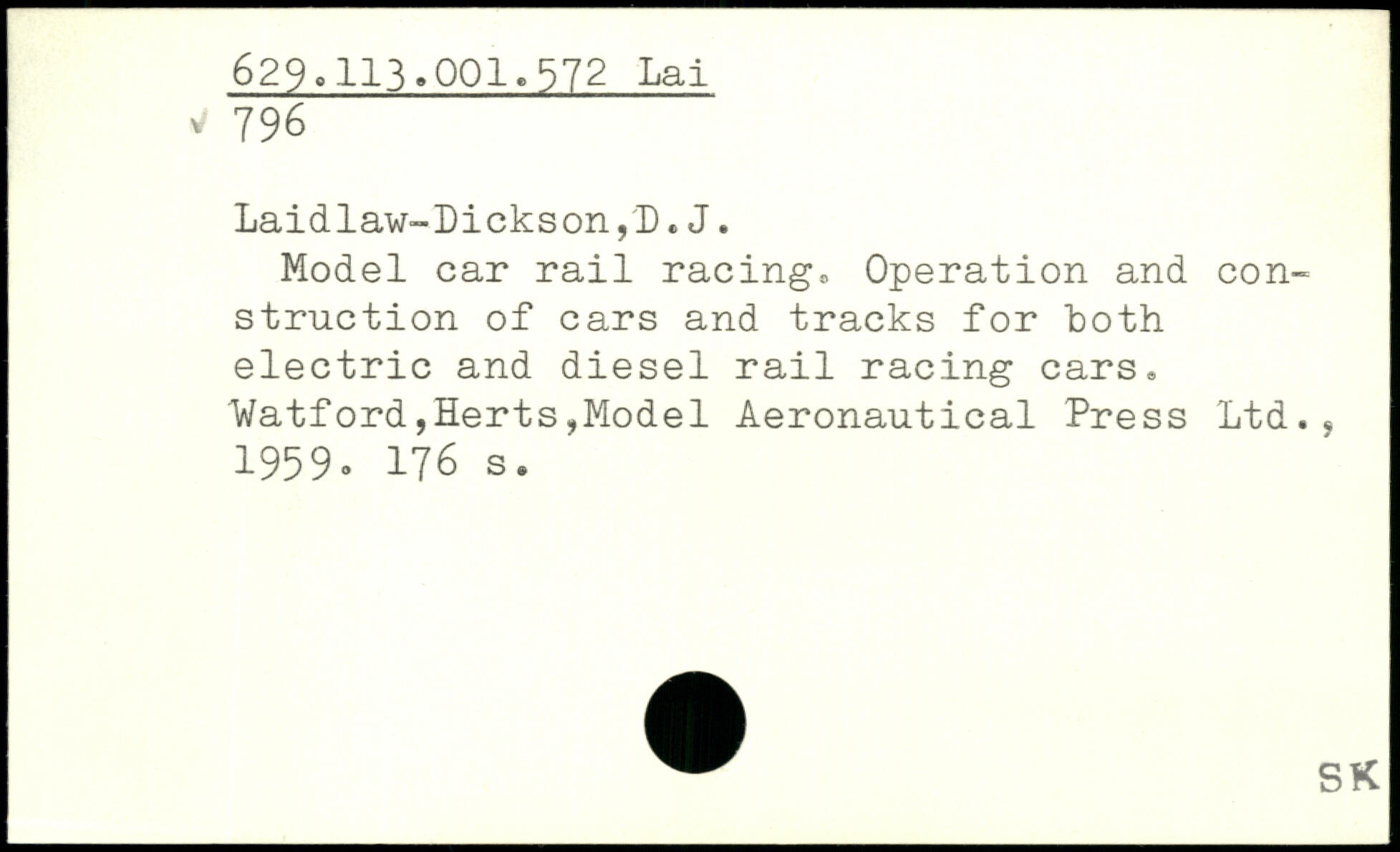 Laidlaw-Dickson ,'D. J. Model car rail racings Operation and construction of cars and tracks for both electric and diesel rail racing cars. Watford,Herts,Model Aeronautical Press Ltd.. 1959.