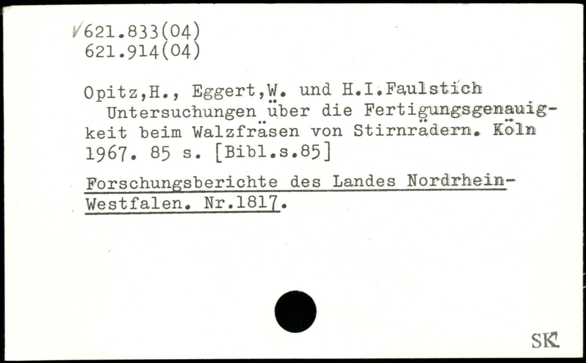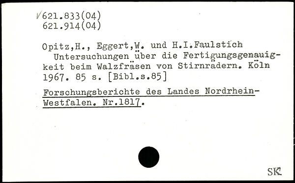 Opitz,H., Eggert ,W. und. H.I. Faulst ich Untersuchungen^über die Fertigungsgenauigkeit beim Walzfräsen von Stirnrädern.
