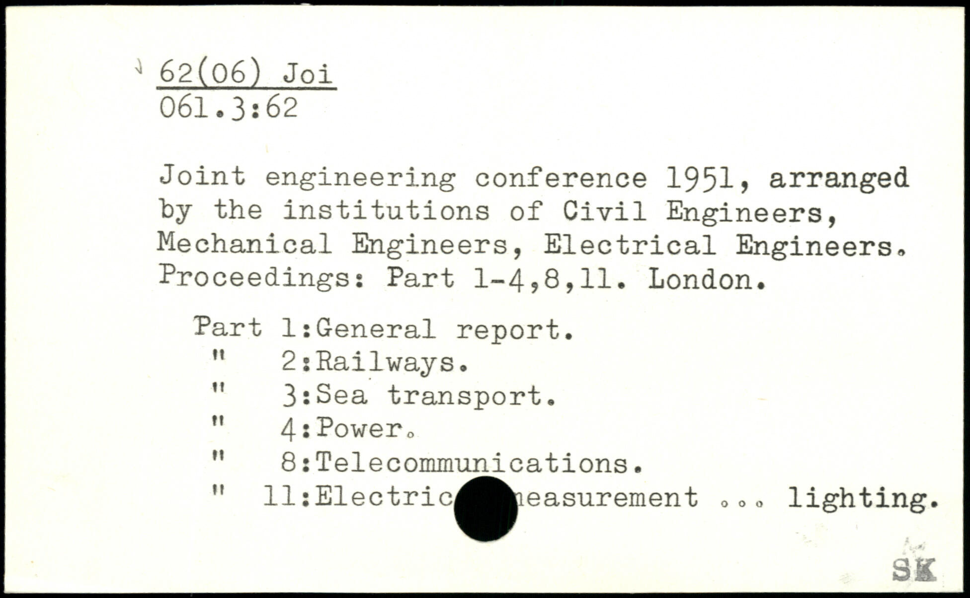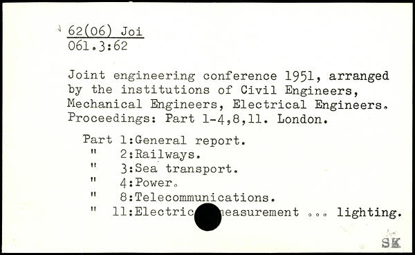 Joint engineering conference 1951, arranged "by the institutions of Civil Engineers, Mechanical Engineers, Electrical Engineers. Proceedings: Part 1-4,8,11. London. Part 1:General report. ” 2îRailways. ” 3:Sea transport. " 4:Power. " 8îTelecommunications. " llîElectric easurement ,o. lighting, j