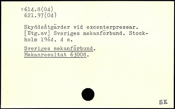 Skyddsatgarder vid excenterpressar. [Utg. avj Sveriges mekanforbund. Stock- j holm 1964.