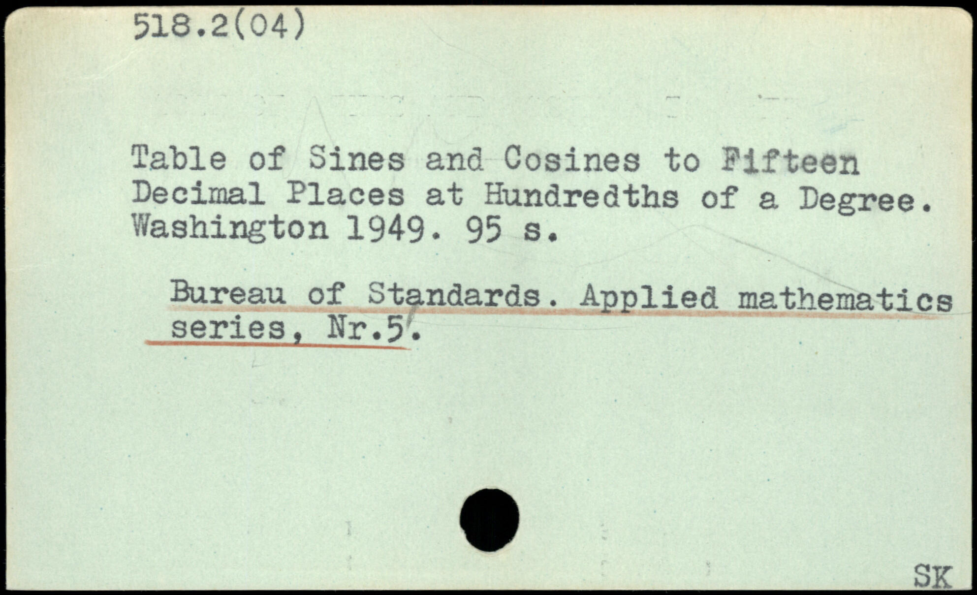 Table of Sines and Cosines to Fifteen Decimal Places at Hundredths of a Degree.