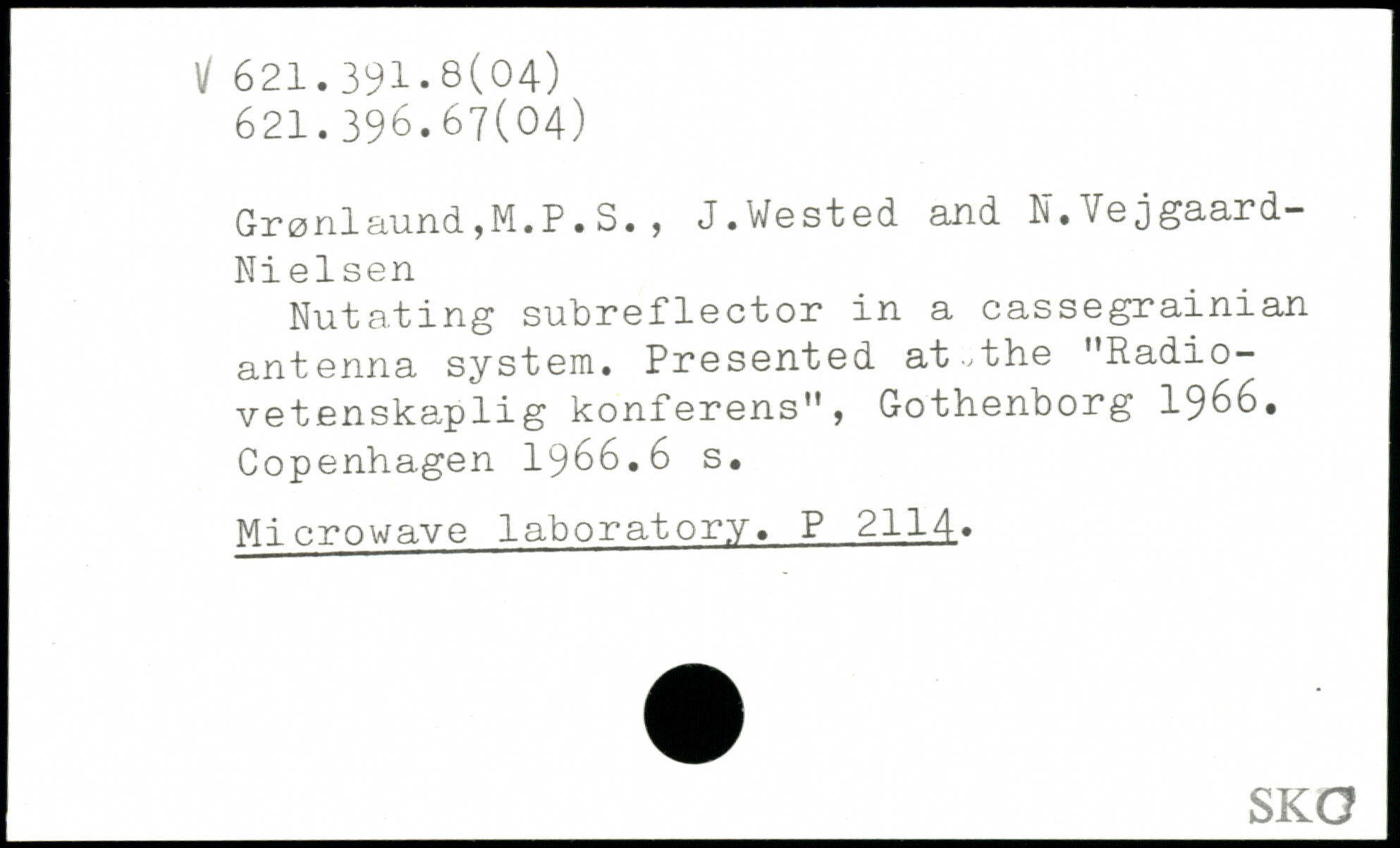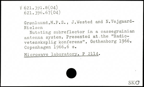 Gr0nlaund,M.P.S., J.Wested and N. Vejgaard- Ni elsen Nutating subreflector in a cassegrainian antenna system. Presented at-the "Radio-vetenskaplig konferens”, Gothenborg 1966.
