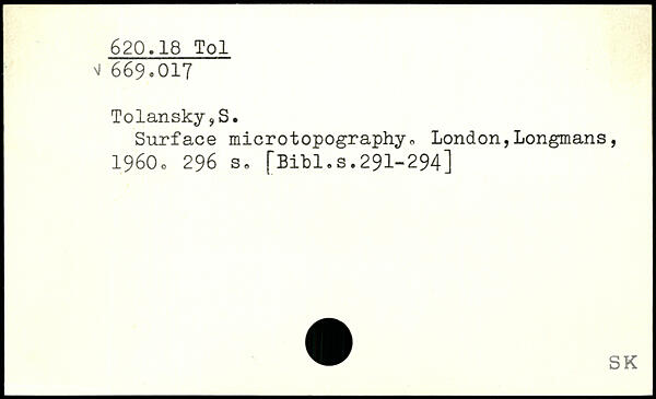 Surface microtopography, London,Longmans, 1960o 296 so [Bibl.s.291-294]
