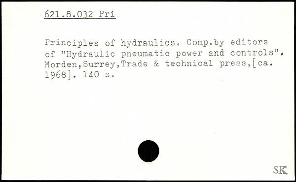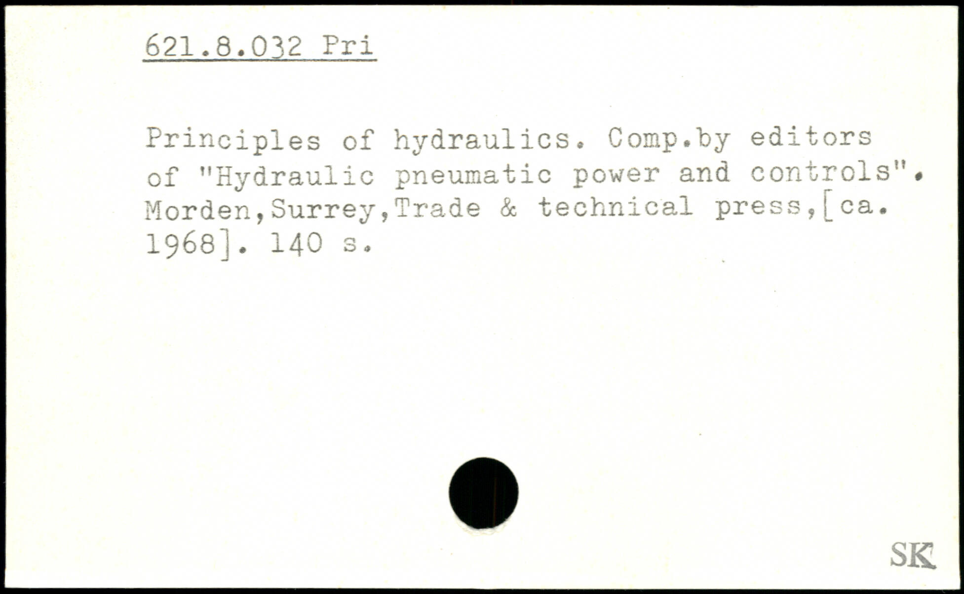 Principles of hydraulics. Comp.by editors of "Hydraulic pneumatic power and controls". Morden,Surrey,Trade & technical press,[ca. 1968]. 140 3.