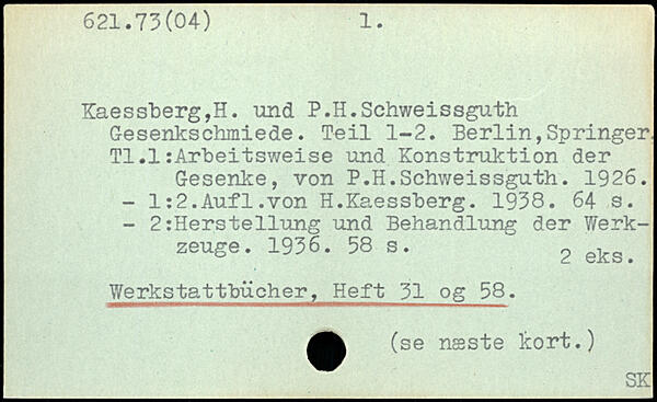 Kaessberg,H. und P.H. Schwei s sgu th Gesenkschmiede. Teil 1-2. Berlin,Springer, Tl.l:Arbeitsweise und Konstruktion der Gesenke, von P.H.Schweissguth. 1926. - l:
