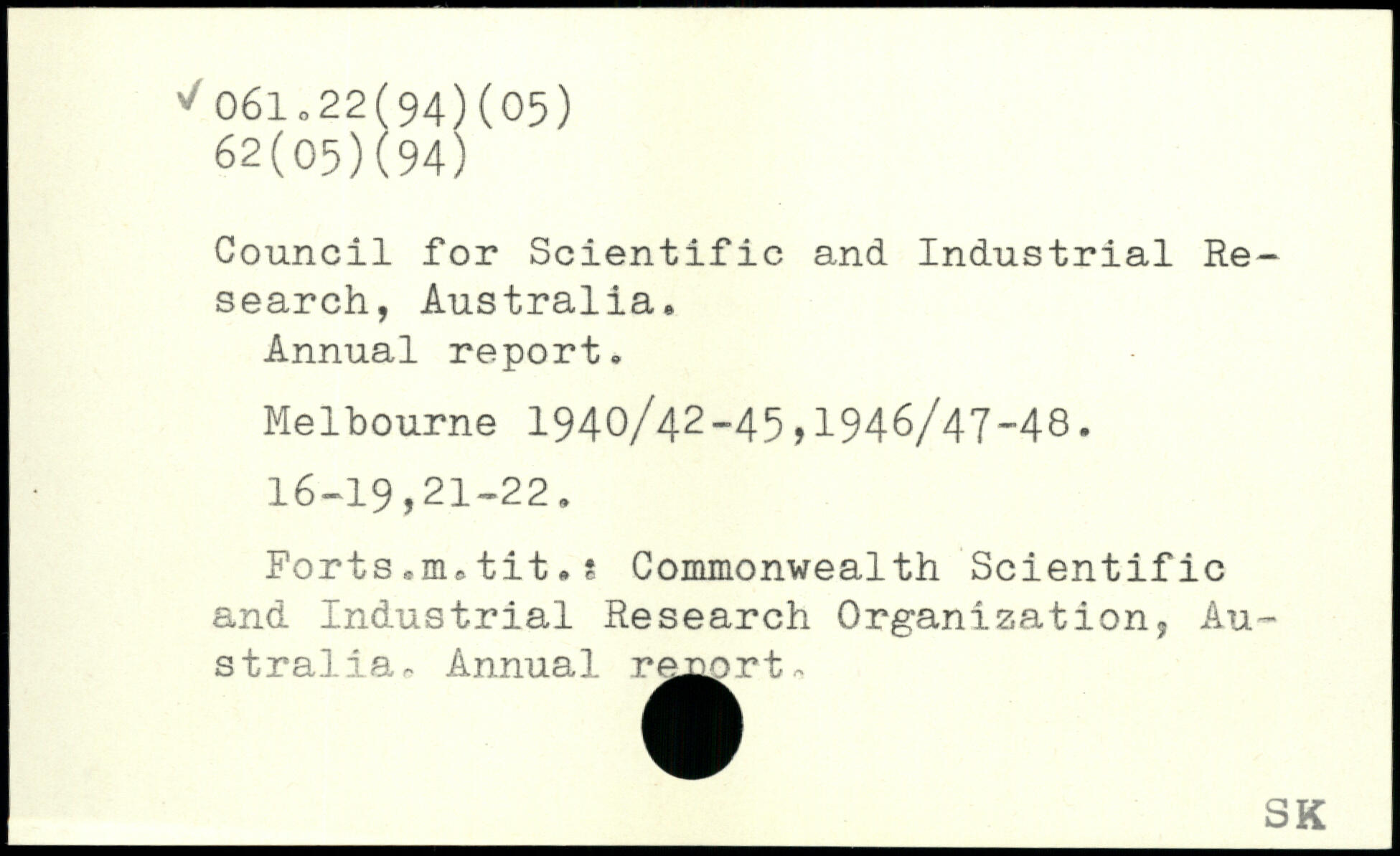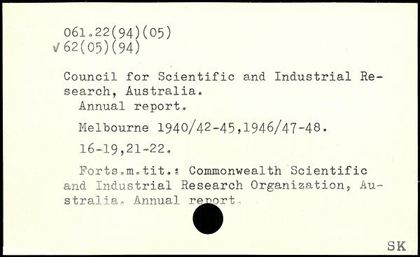 Council for Scientific and Industrial Research, Australia. Annual report. Melbourne 1940/42-45,1946/47-48. 16-19,21-22. Forts.m.tit.s Commonwealth Scientific and Industrial Research Organization, Australia. Annual