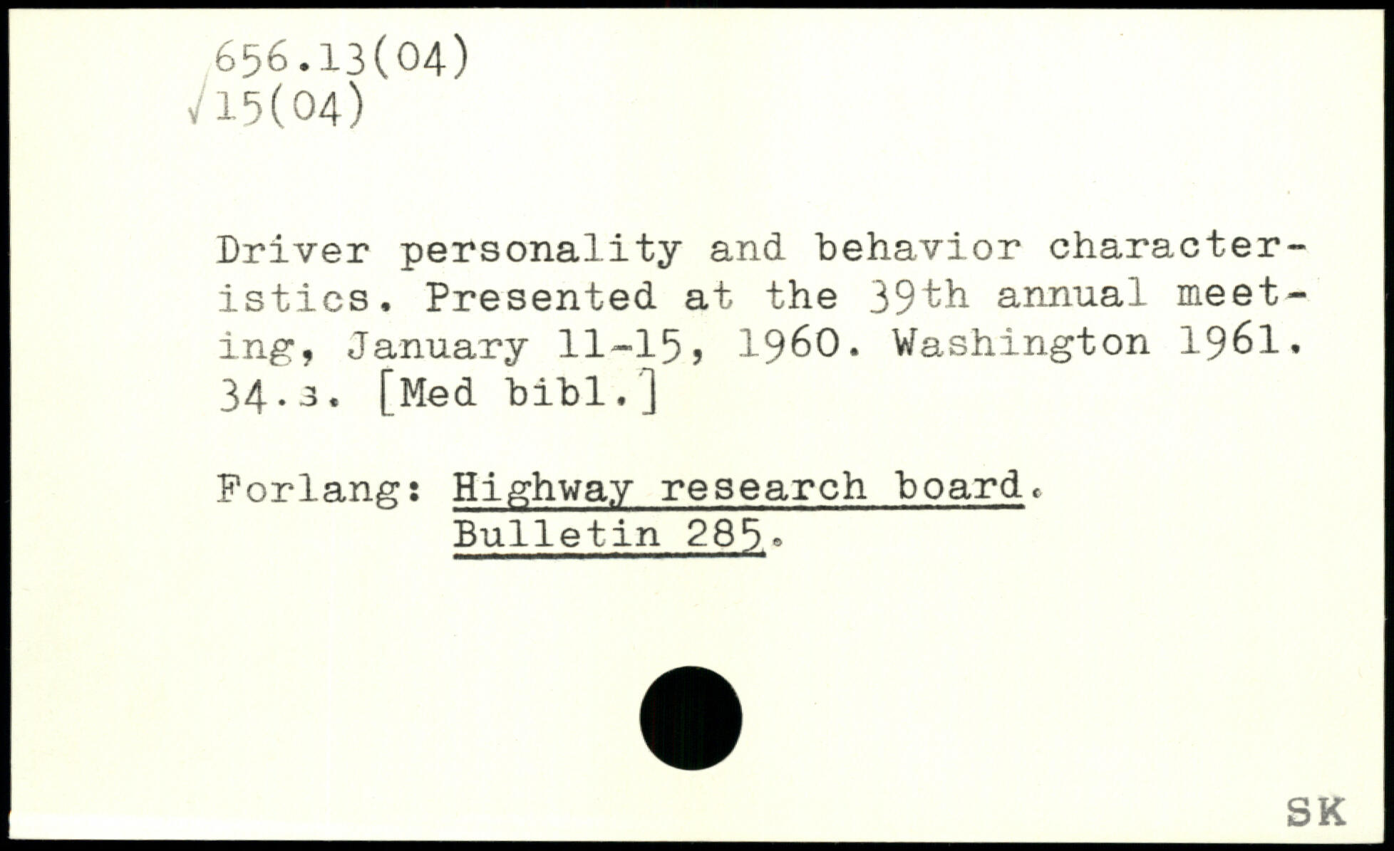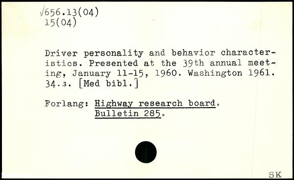 Driver personality and behavior characteristics. Presented at the 39th annual meeting, January 11-15> 1960.