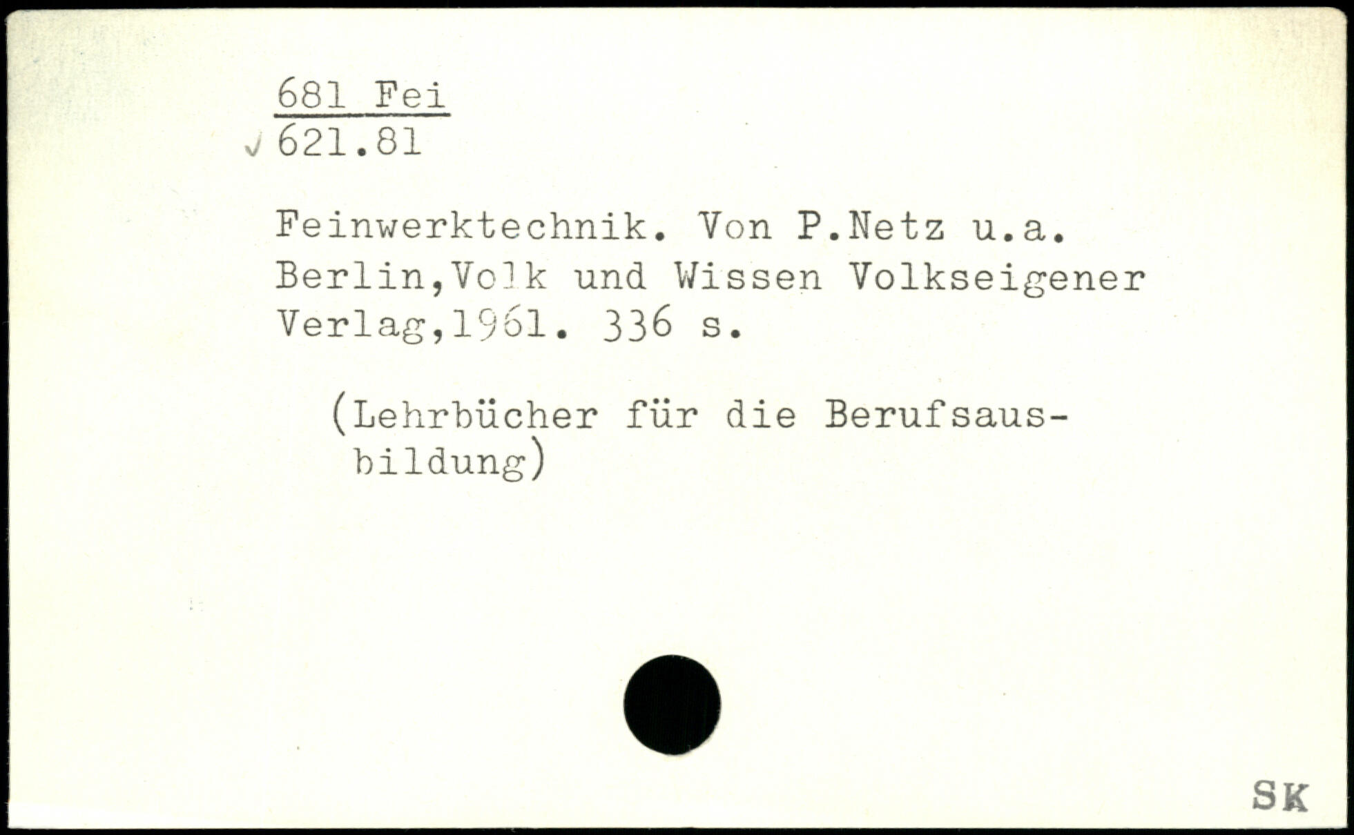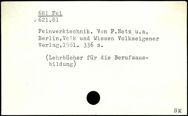 Feinwerktechnik. Von P.Netz u.a. Berlin,Volk und Wissen Volkseigener Verlag,1961.