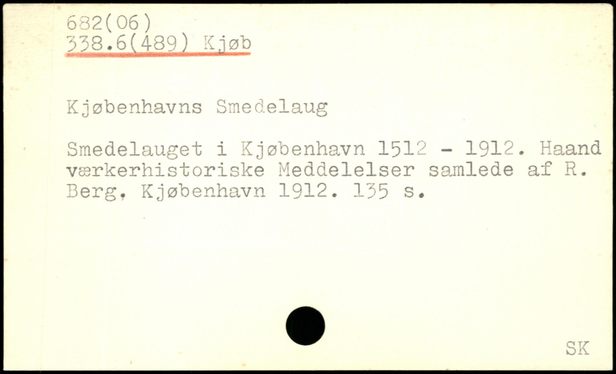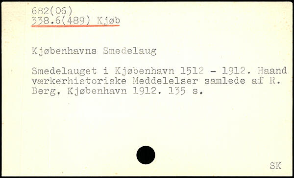 'v;8.6(489) It.iøb Kjøbenhavns Smedelaug Smedelauget i Kjøbenhavn 1512 - 1912. Haand værkerhistoriske Meddelelser samlede af R. Berg. Kjøbenha,vn 1912.