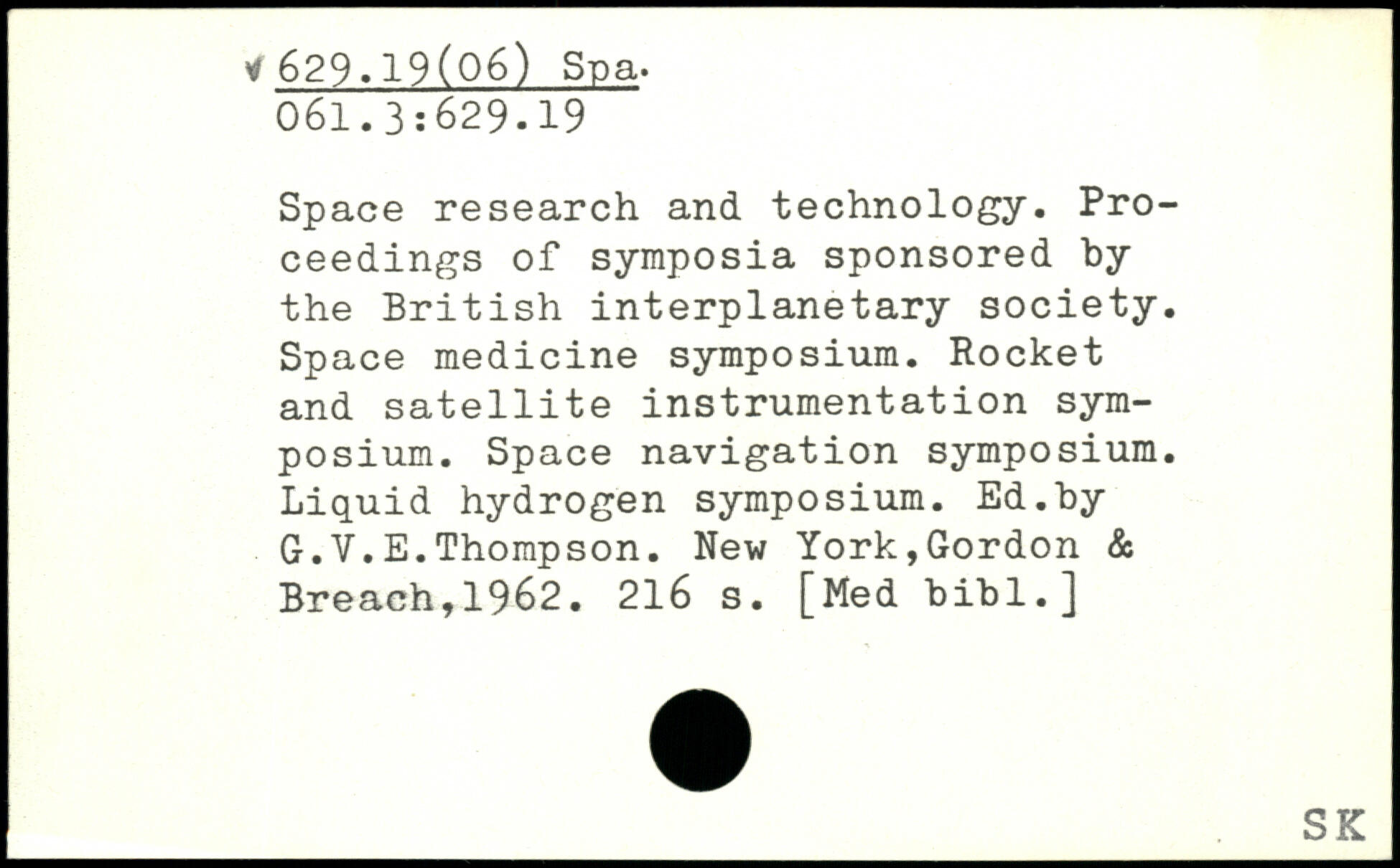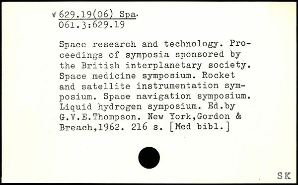 Space research and technology. Proceedings of symposia sponsored by the British interplanetary society. Space medicine symposium. Rocket and satellite instrumentation symposium. Space navigation symposium. Liquid hydrogen symposium. Ed.by G.V.E.Thompson.