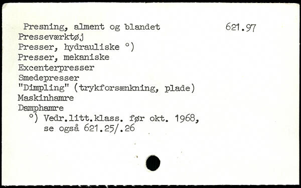 Presning, alment og blandet 621.97 Presseværktøj Presser, hydrauliske .) Presser, mekaniske Excenterpresser Smedepresser "Dimpling" (trykforsænkning, plade) Maskinhamre Damphamre .) Vedr.litt.klass. før okt. 1968, se også 621.25/.26