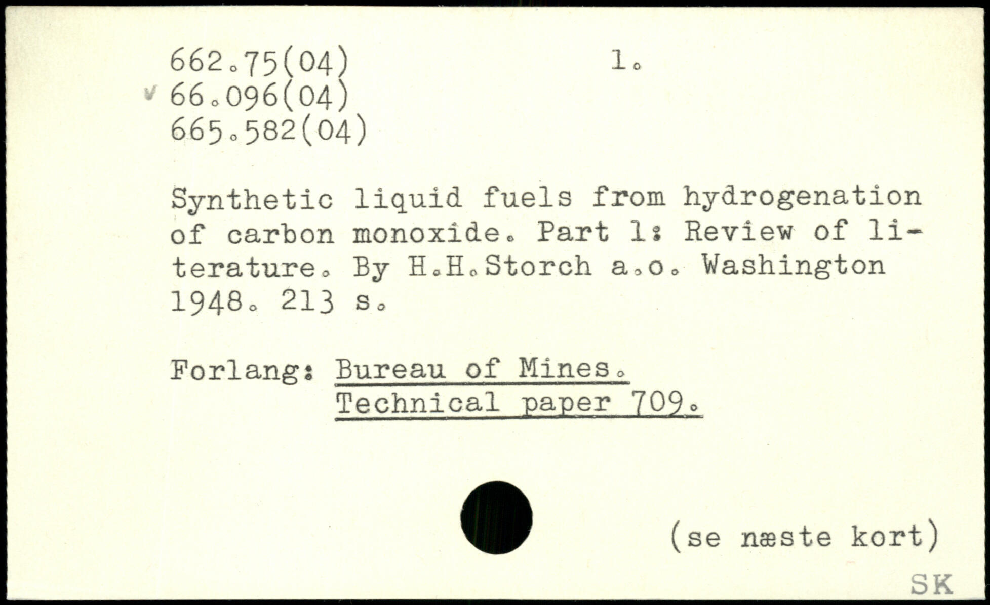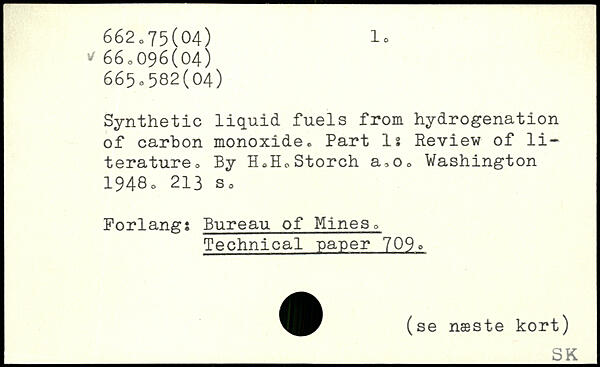 Synthetic liquid fuels from hydrogenation of carbon monoxide. Part Is Review of literature. By H.H.Storch a.o.