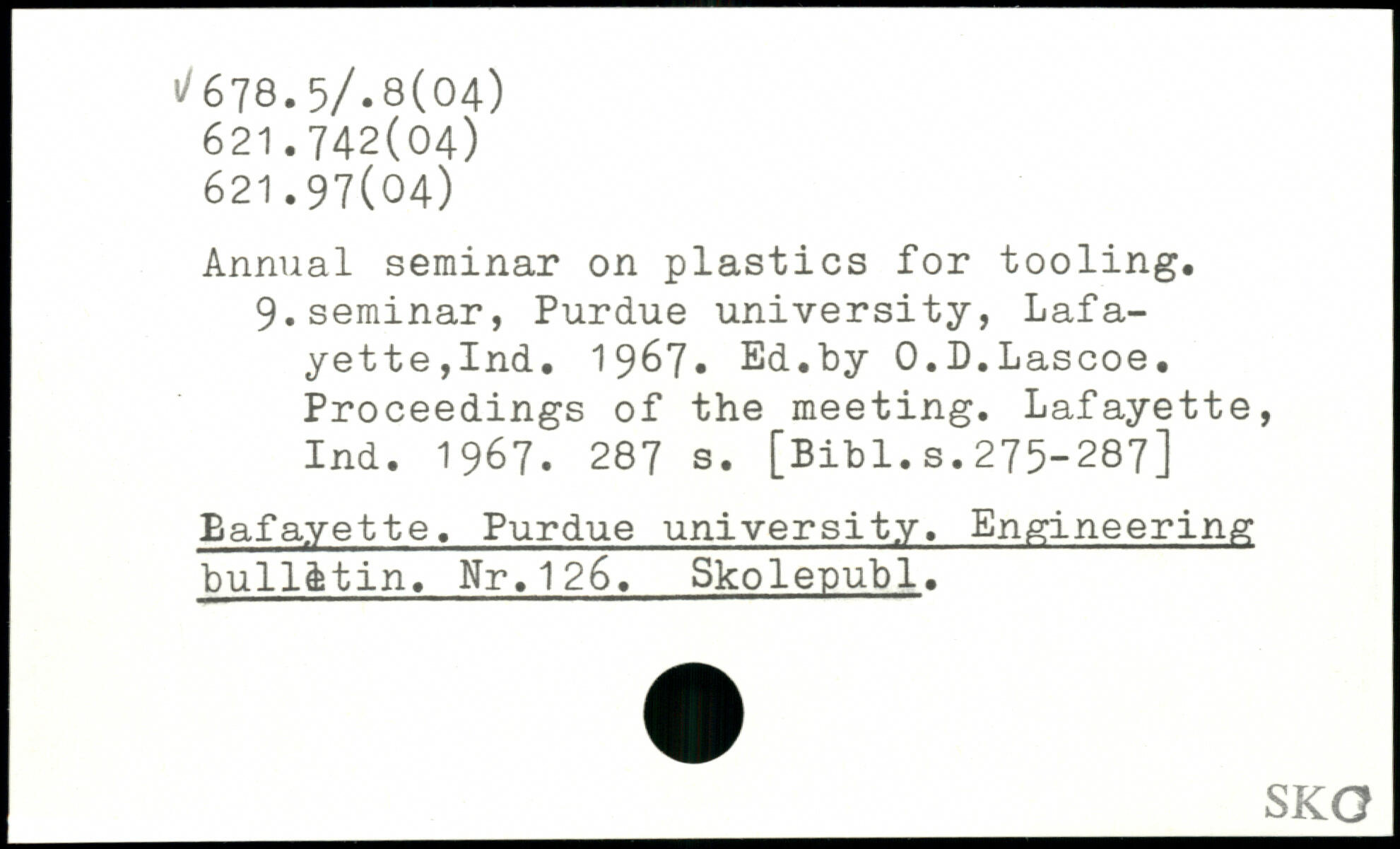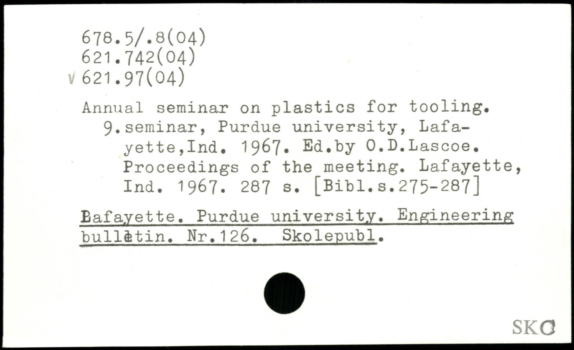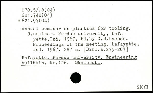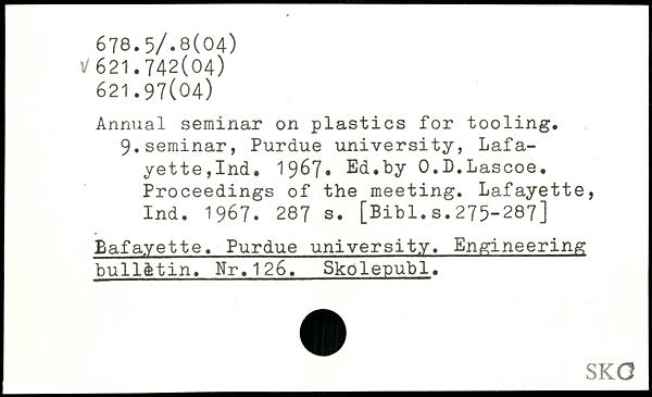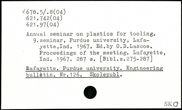 Annual seminar on plastics for tooling. 9.seminar, Purdue university, Lafayette,Ind. 1967. Ed.by O.D.Lascoe. Proceedings of the meeting. Lafayette, Ind. 1967.