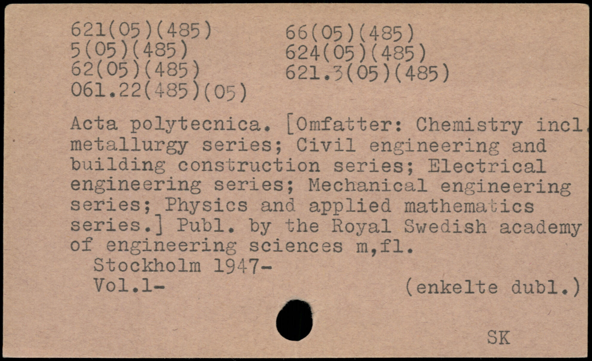 Acta polytecnica. [Omfatter: Chemistry incl metallurgy series; Civil engineering and building construction series; Electrical engineering series; Mechanical engineering series; Physics and applied mathematics series.]