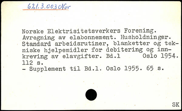 Norske Elektrisitetsverkers Forening. Avregning av elabonnement. Husholdninger. Standard arbeidsrutiner, blanketter og tekniske hjelpemidler for debitering og inn-kreving av elavgifter. Bd.l Oslo 1954-.