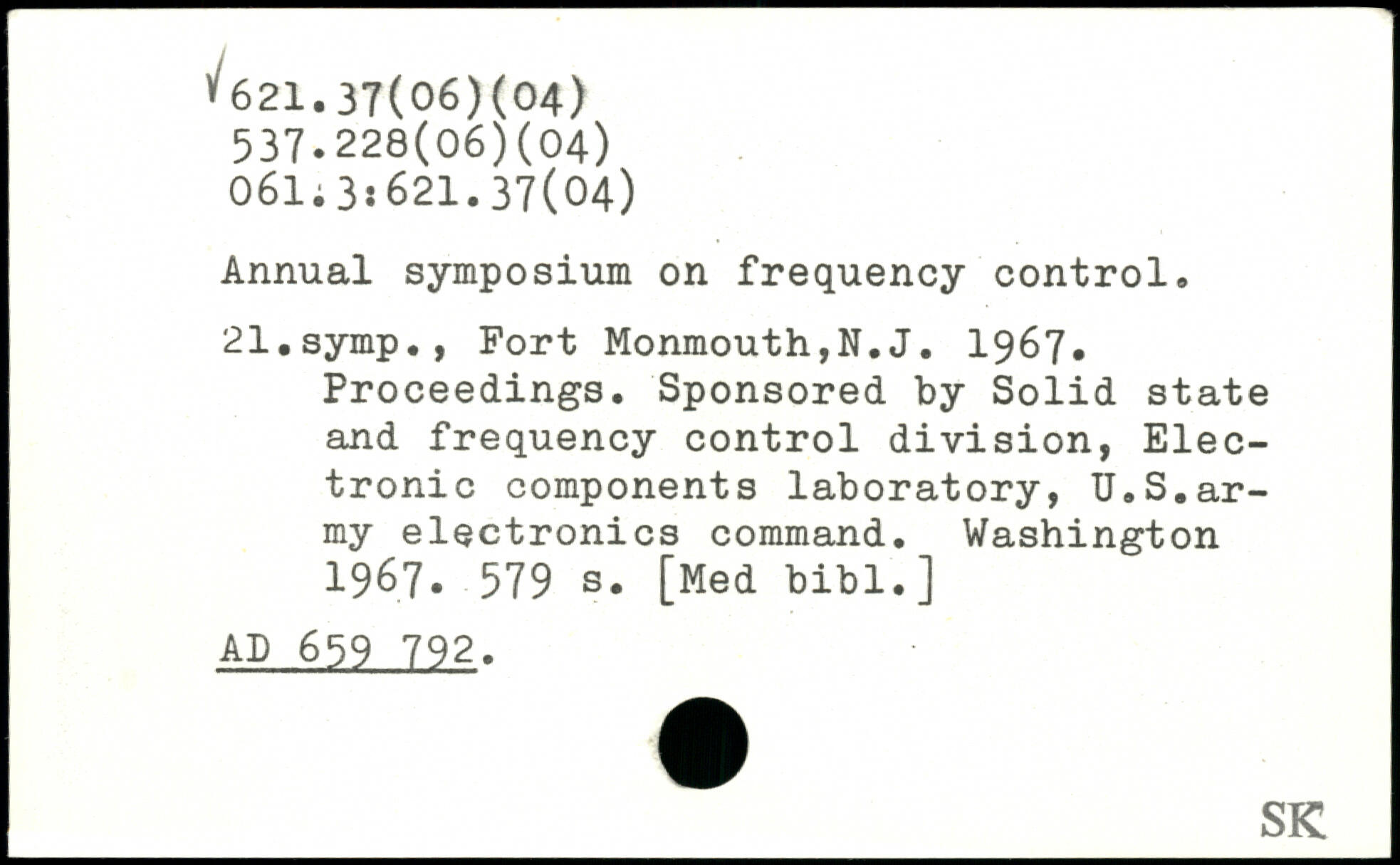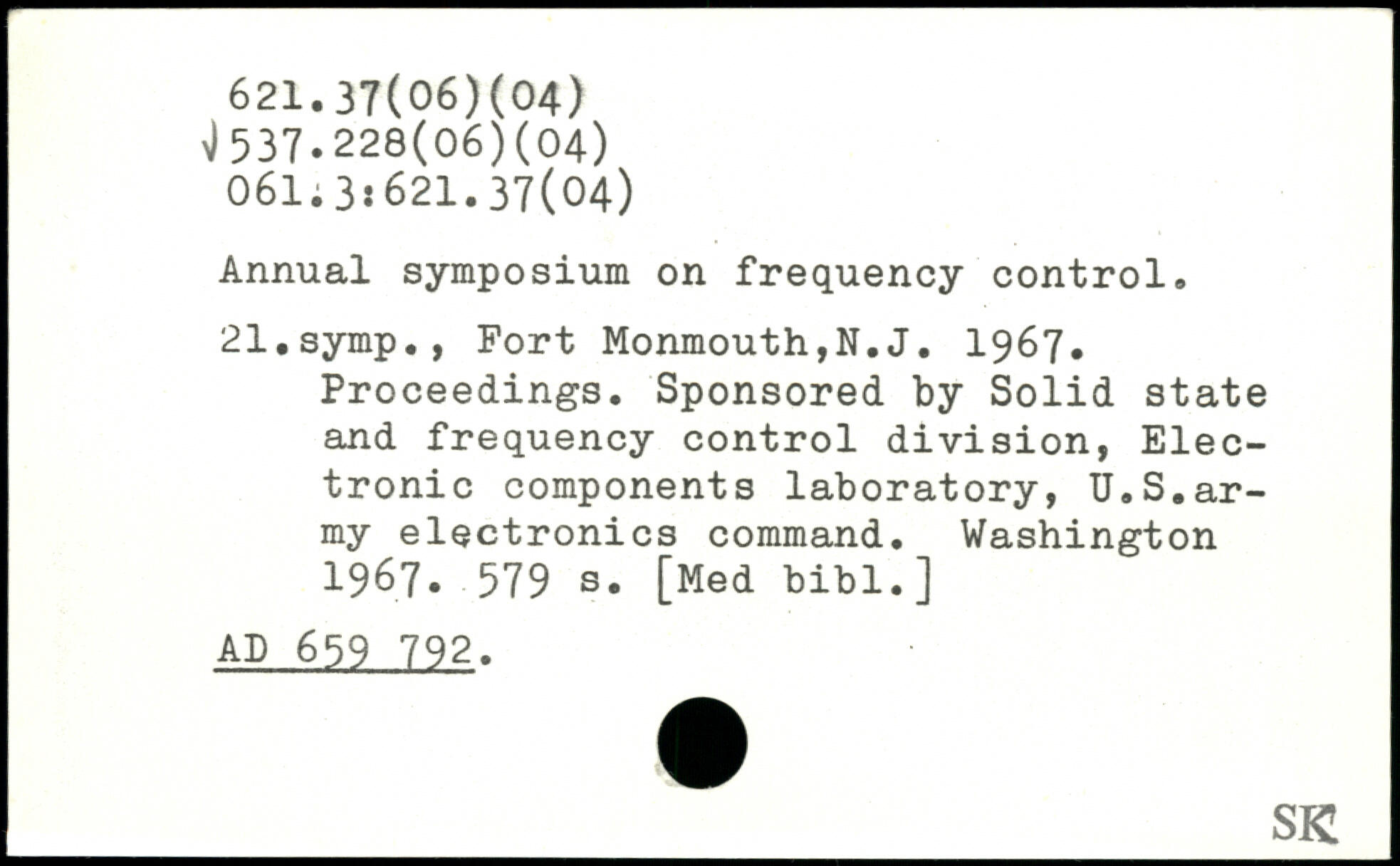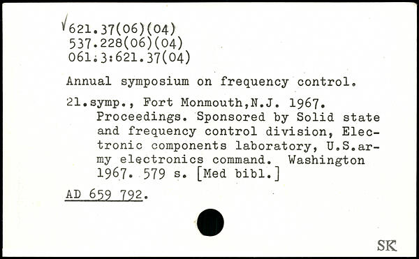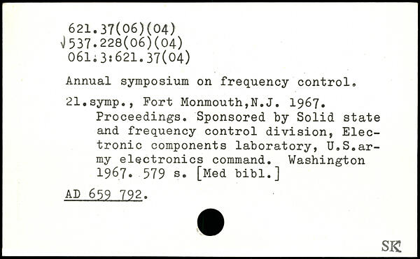 Annual symposium on frequency control. 21.symp., Fort Monmouth,N.J. 1967. Proceedings. Sponsored by Solid state and frequency control division, Electronic components laboratory, U.S.army electronics command.