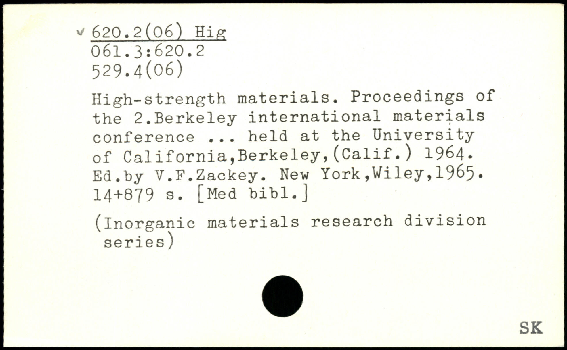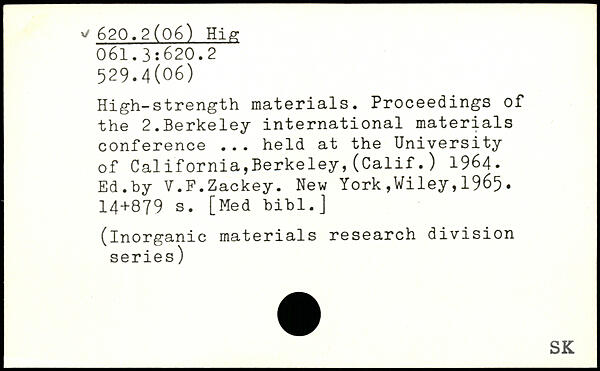 High-strength materials. Proceedings of the 2.Berkeley international materials conference ... held at the University of California,Berkeley,(Calif.) 1964. Ed.by V.F.Zackey.