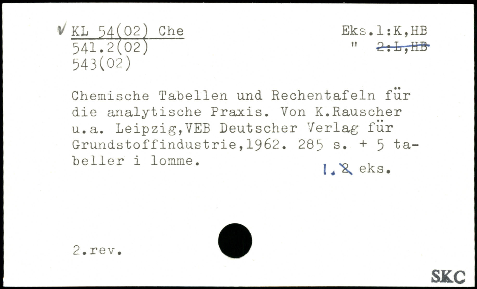 Chemische Tabellen und Rechentafeln für die analytische Praxis. Von K.Rauscher u.a. Leipzig,VEB Deutscher Verlag für Grundstoffindustrie,1962. 28S s. + 5 Tabelle r i lomme. ^ , I ^ 0KS.