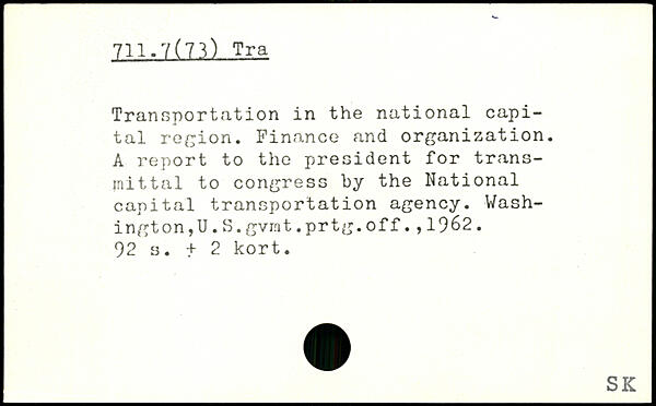 Transportation in the national capital région. Finance and organization. A report to the president for transmittal to congress by the National capital transportation agency. Washington, U. S.gvrnt.prtg. off. ,1962.