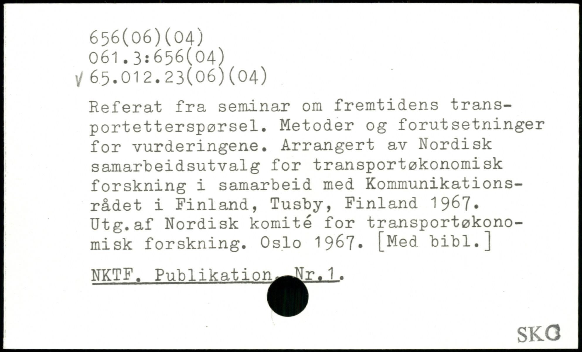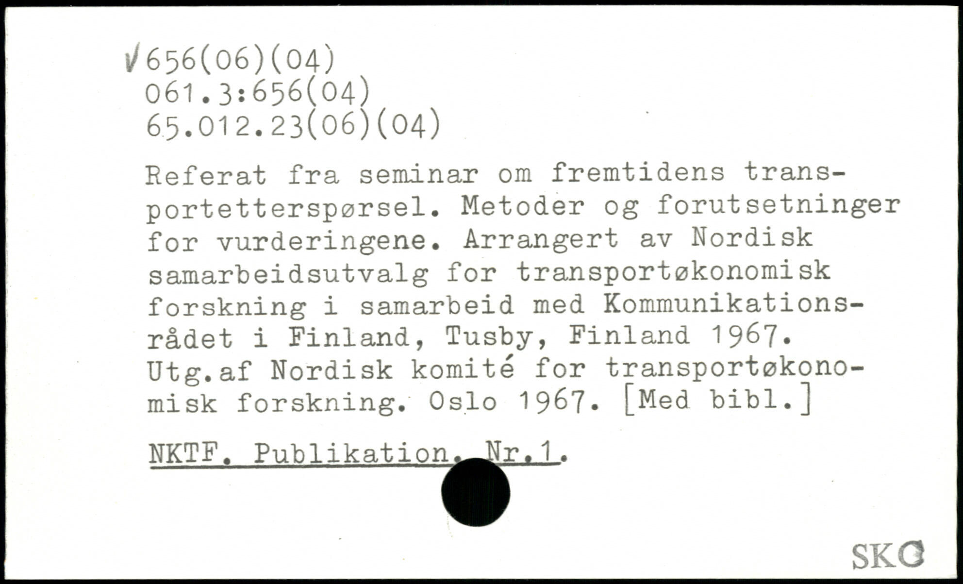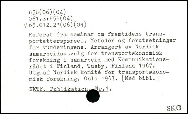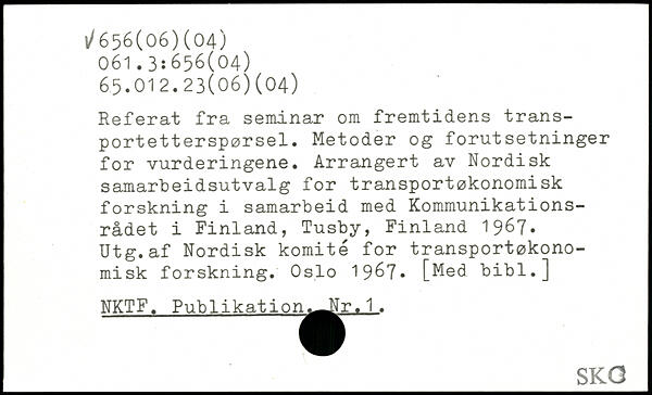 Referat fra seminar om fremtidens trans-portetterspørsel. Metoder og forutsetninger for vurderingene. Arrangert av Nordisk samarbeidsutvalg for transportøkonomisk forskning i samarbeid med Kommunikationsrådet i Finland, Tusby, Finland 1967, Utg.af Nordisk komité for transportøkonomisk forskning. Oslo 1967