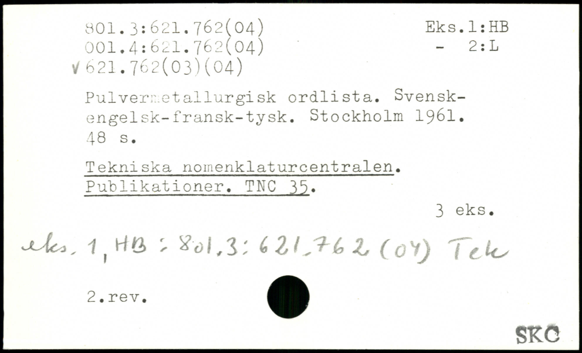Pulvermetallurgi sk ordlista. Svensk-engelsk-fransk-tysk.