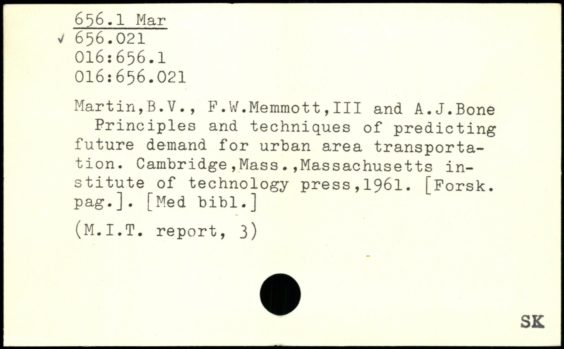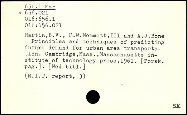 Martin,B.V., F.W.Memmott,III and A.J.Bone Principles and techniques of predicting future demand for urban area transportation. Cambridge,Mass.,Massachusetts institute of technology press,1961. [Forsk, pag.]. [Med bibl.]