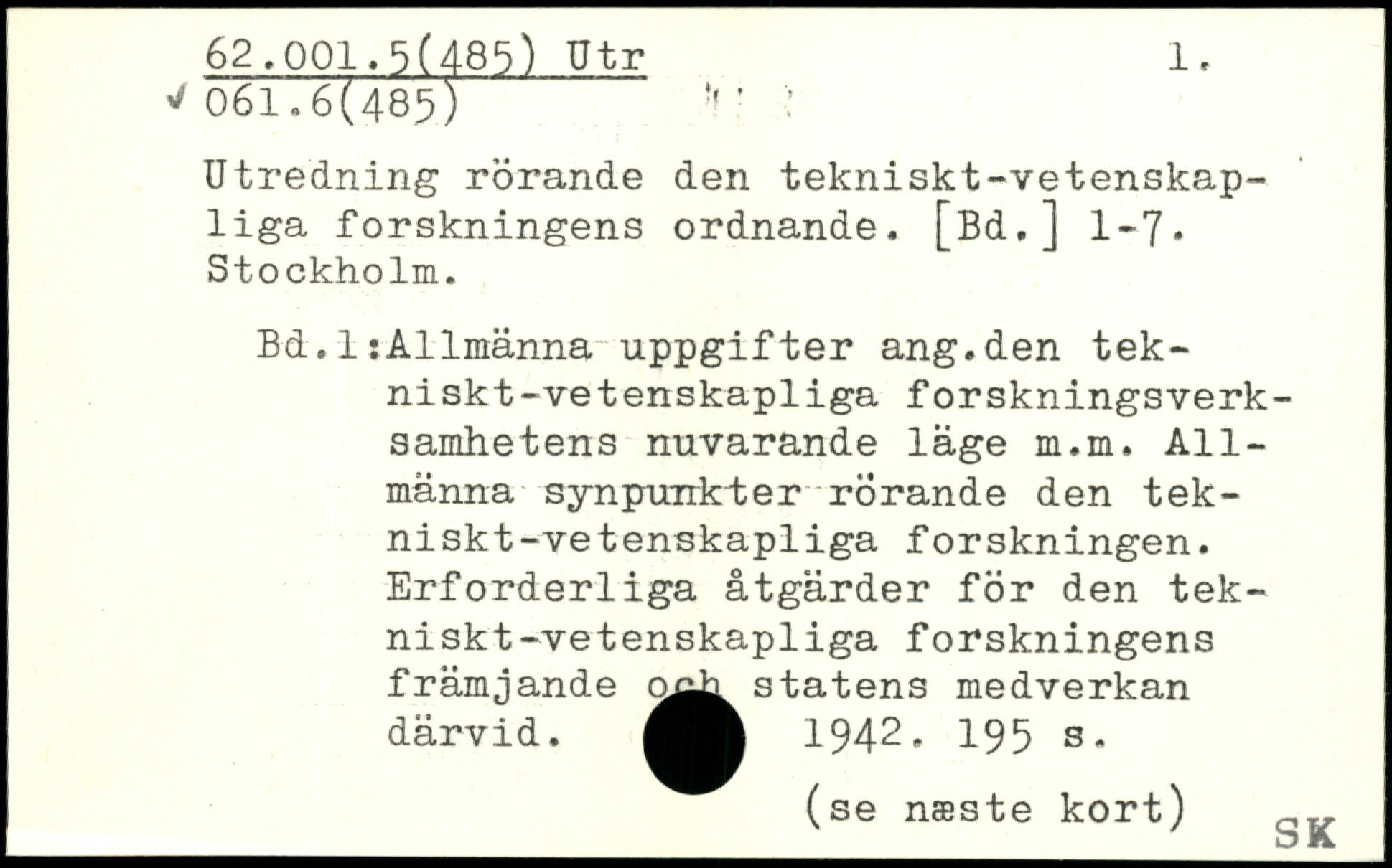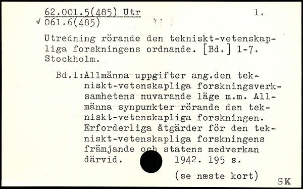 Utredning rörande den tekniskt-vetenskap-liga forskningens ordnande. [Bd.] 1-7. Stockholm.