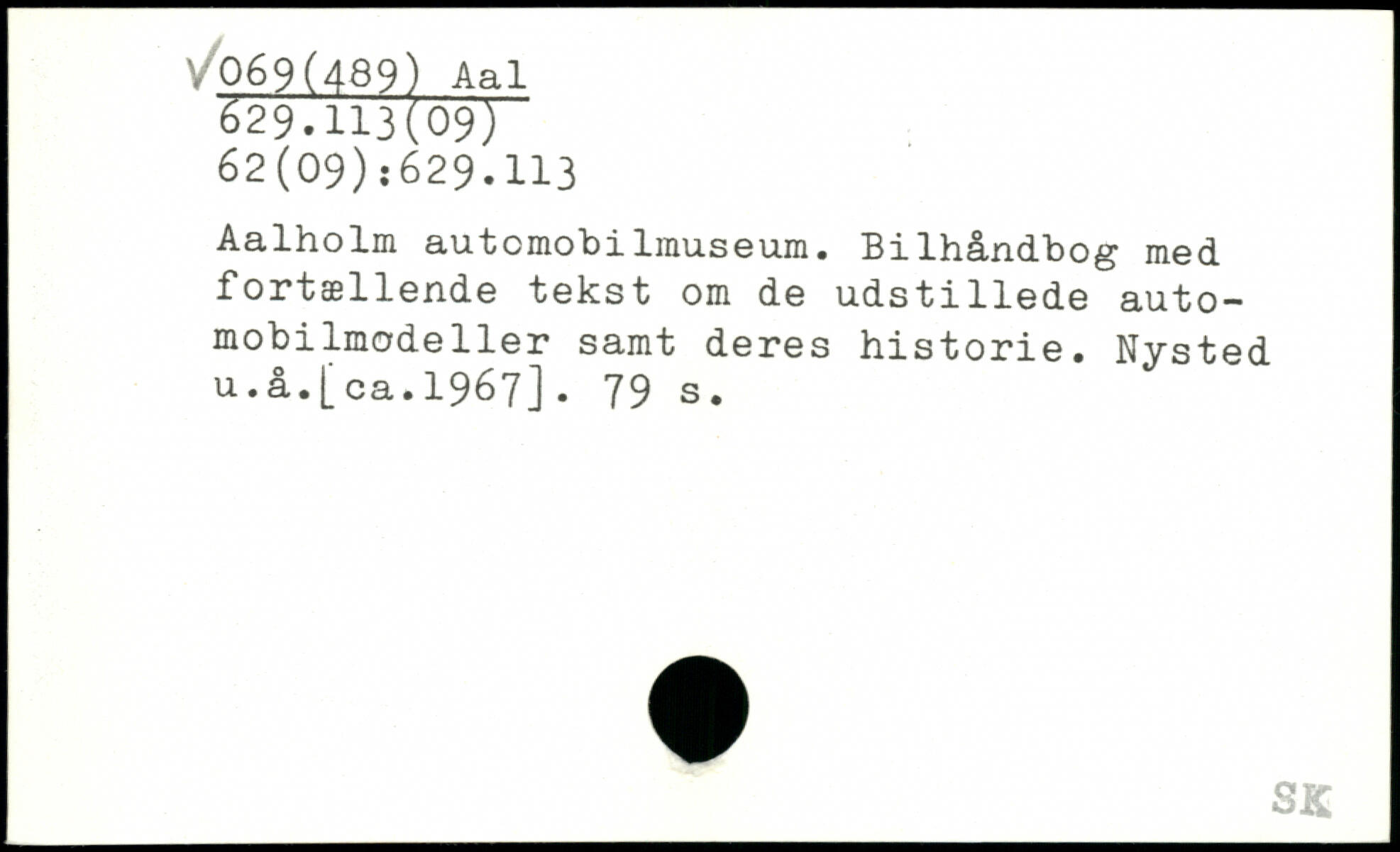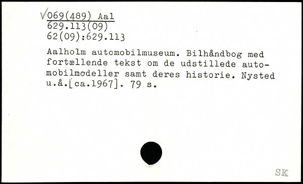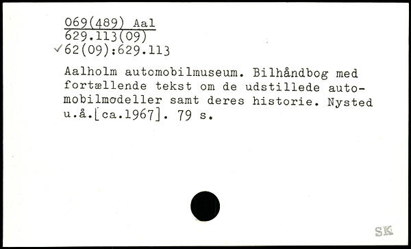 Aalholm automobilmuseum. Bilhåndbog med fortællende tekst om de udstillede automobilmodeller samt deres historie. Nysted u.å.[ca.1967].
