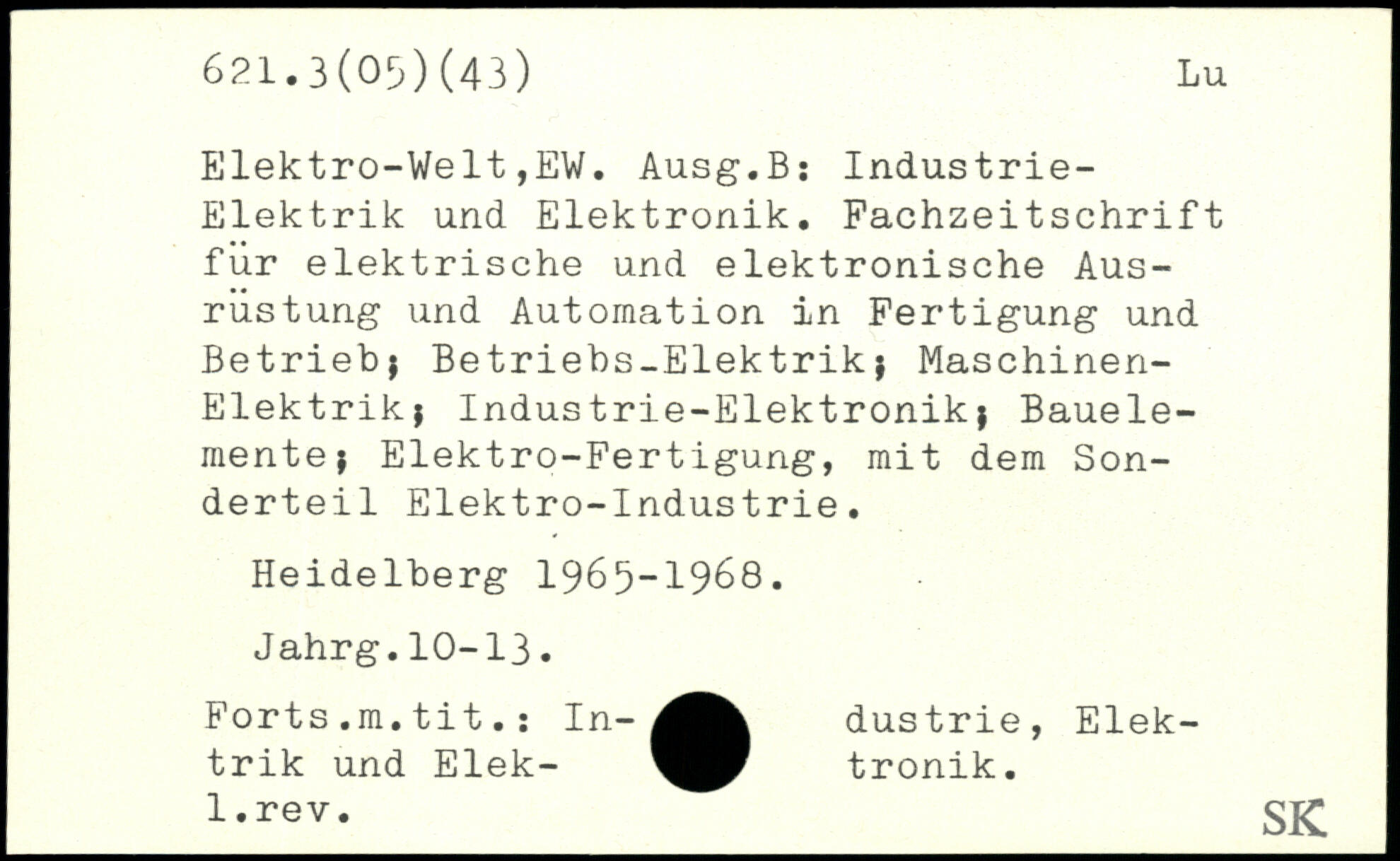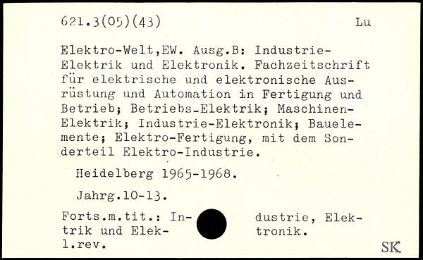Elektro-Welt,EW. Ausg.B: Industrie-Elektrik und Elektronik. Fachzeitschrift für elektrische und elektronische Ausrüstung und Automation in Fertigung und Betrieb; Betriebs-Elektrik; Maschinen-Elektrik; Industrie-Elektronik; Bauelemente; Elektro-Fertigung, mit dem Sonderteil Elektro-Industrie. Heidelberg 1965-1968. Jahrg.10-13. Forts.m.tit. : In- dustrie, Elektrik und Elek- tronik. _I-rev._SK