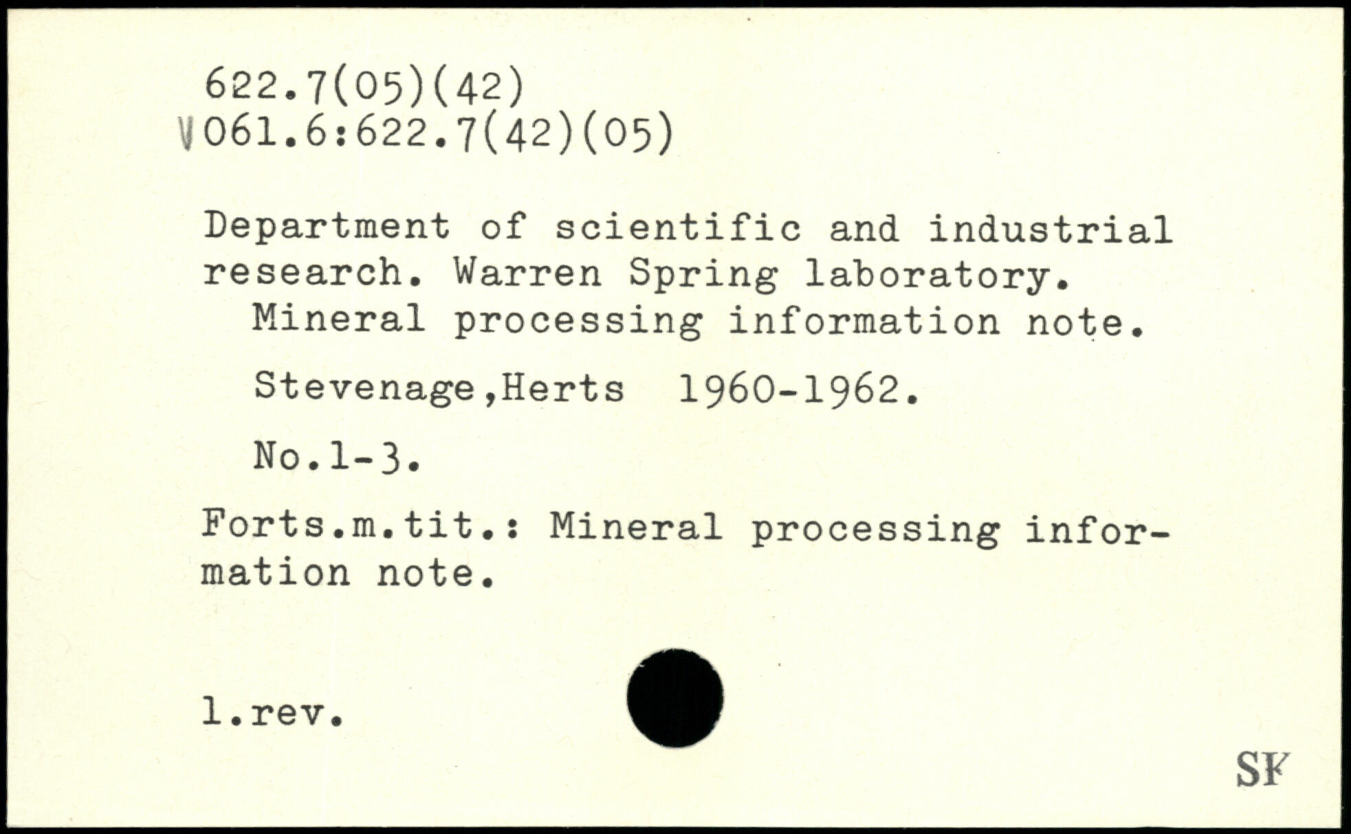 Department of scientific and industrial research. Warren Spring laboratory. Mineral processing information note. Stevenage,Herts 1960-1962. No.1-3. Forts.m.tit.: Mineral processing information note. SF