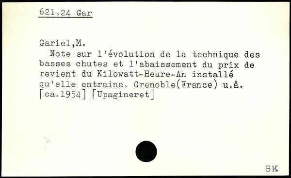 Note sur l'évolution de la technique des basses chutes et l'abaissement du prix de revient du Kilowatt-Heure-An installé qu'elle entraineo Grenoble(France) Ucâ. [ea.1954] (üpagineret]